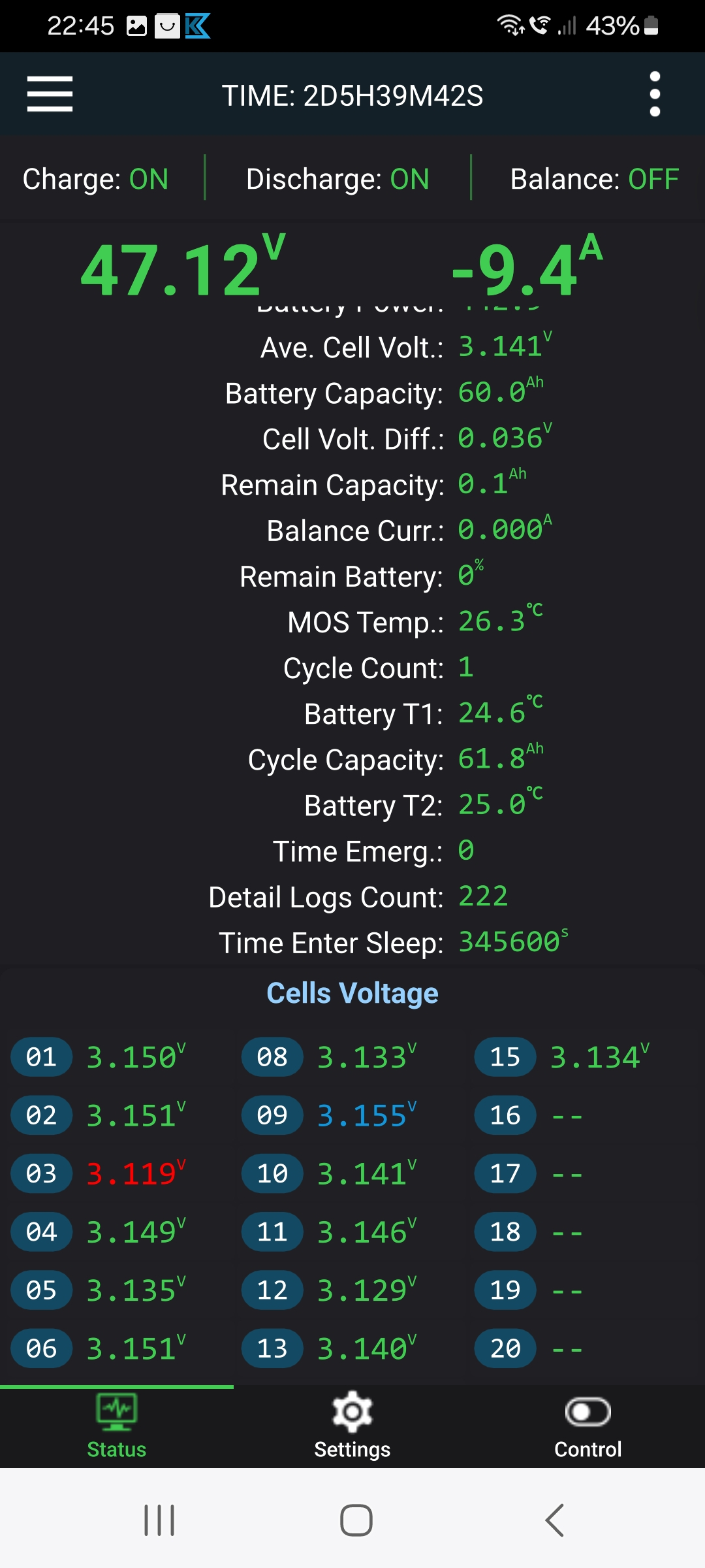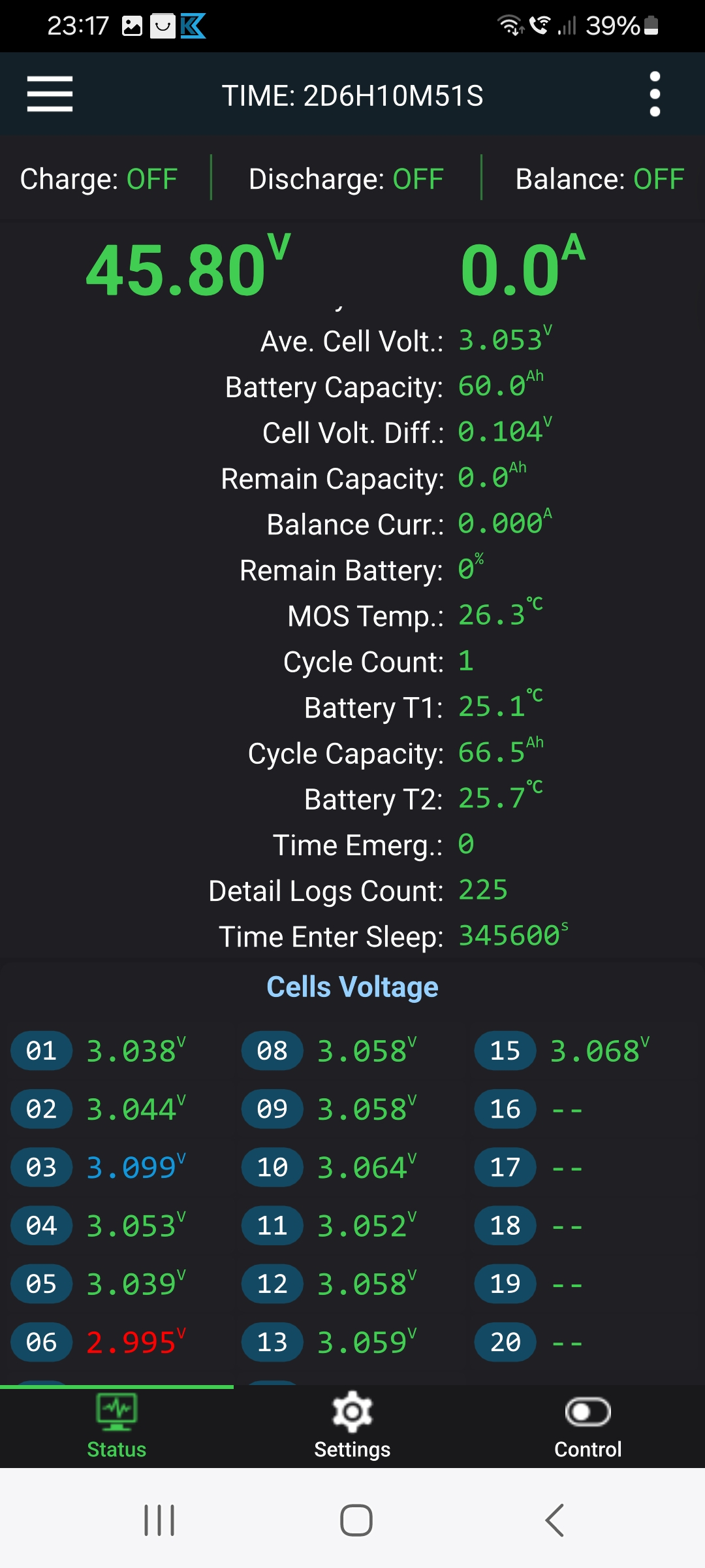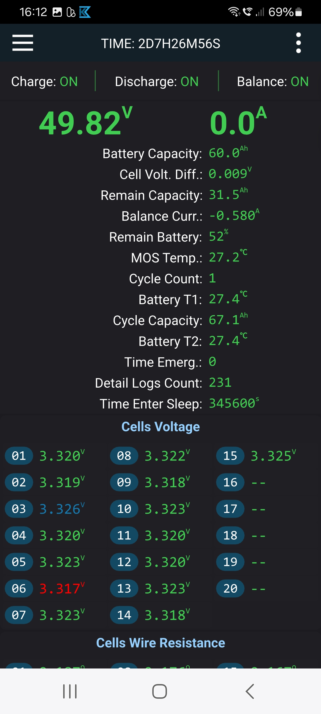 In zwei Tagen hat das frisch verbaute aktive JK-BMS die Zellen mit 0,6A Balancerstrom angeglichen.