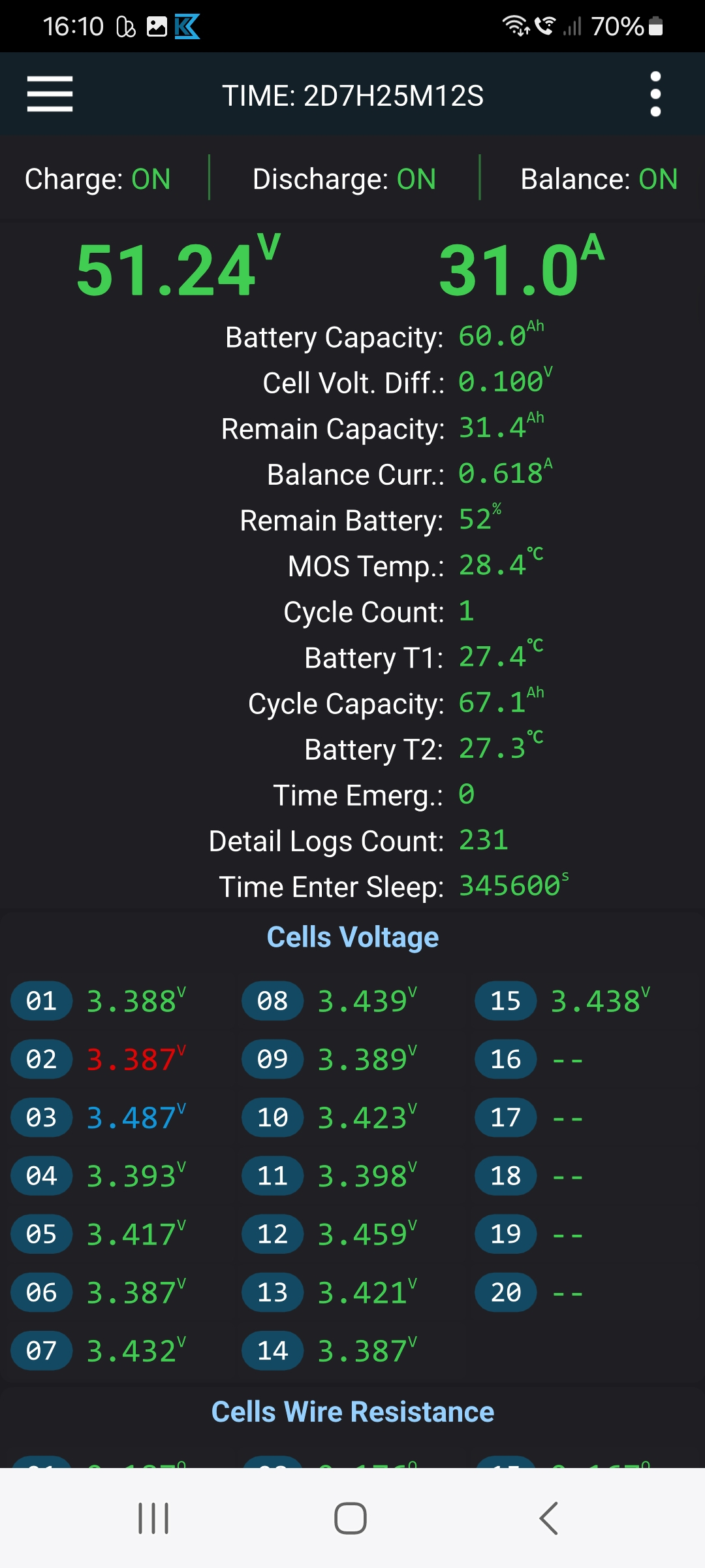 Den Akku heute mit 31A wieder auf 50% geladen. Die Stromabweichung des BMS war vernachlässigbar von daher scheint der Akku mehr Kapazität zu haben als drauf steht.