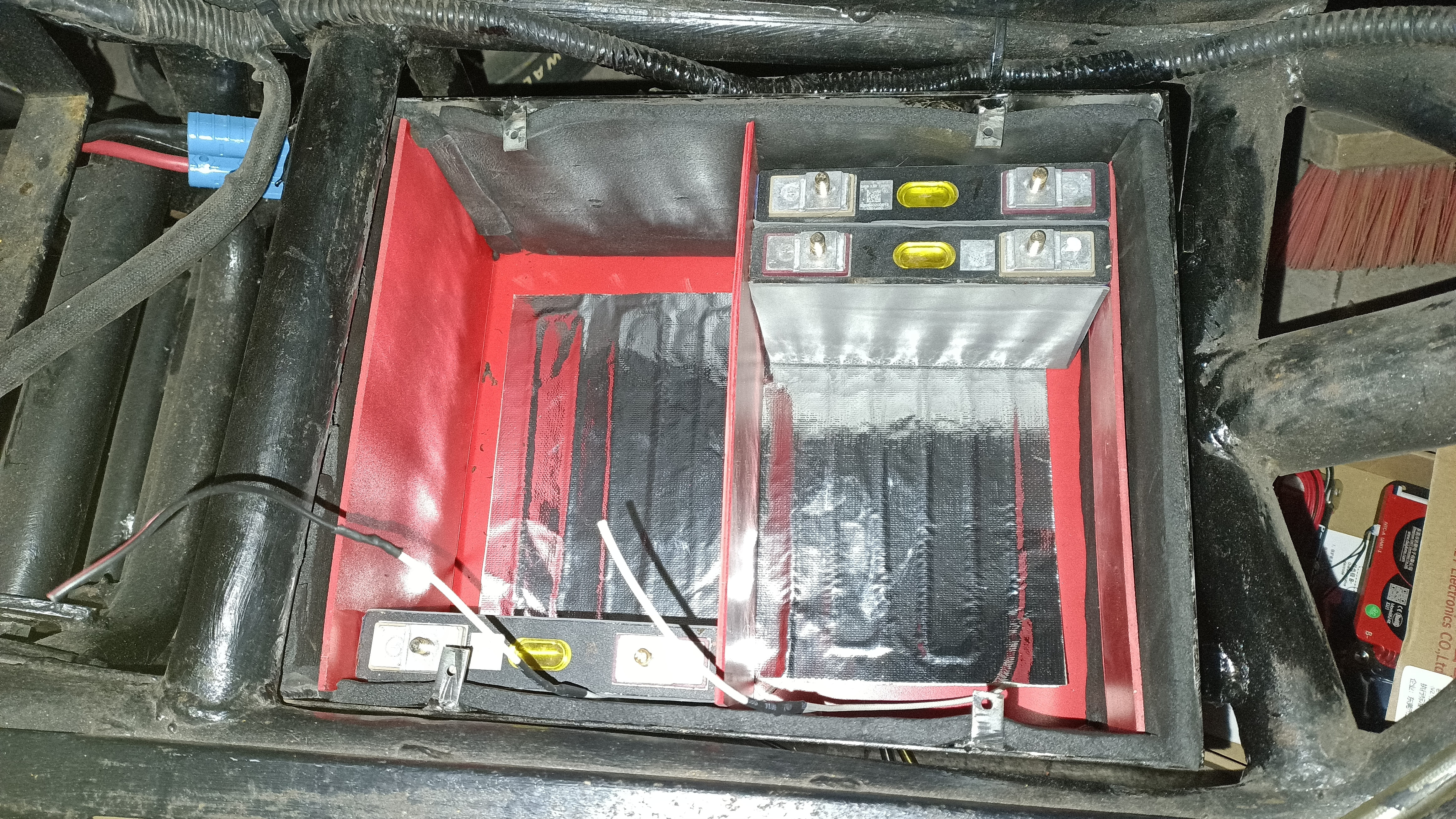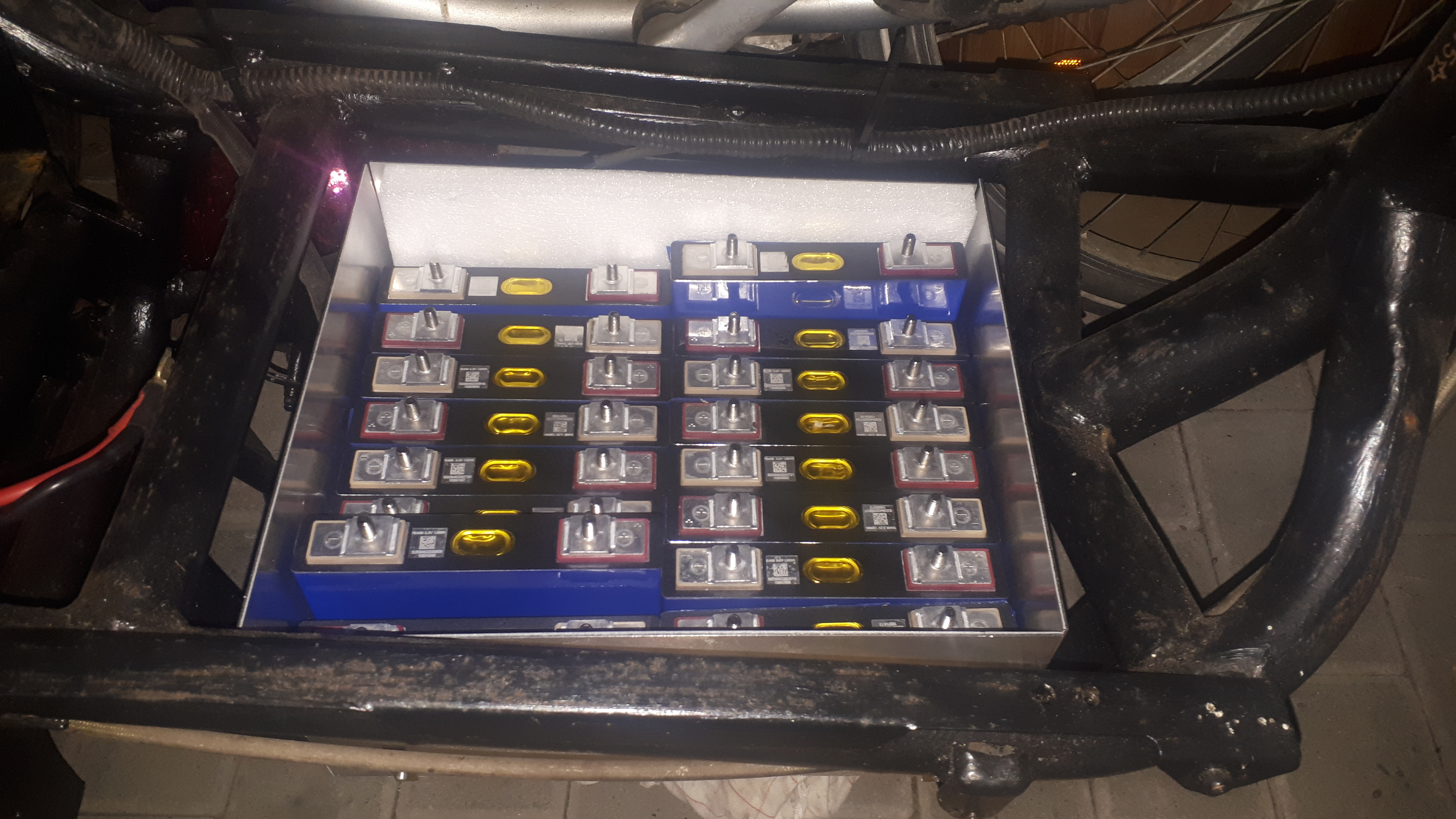 Die Box besteht aus 2mm Alublech, genietet und abgedichtet. Der Boden und Deckel bekommt eine Kunststoff Platte um kurzschlüsse zu vermeiden. Die Zellen werden nochmal zusätzlich umwickelt bevor sie endgültig in den Kasten kommen, jetzt muss ich nur noch entsprechende aussparung einbauen für bms plus und minus.