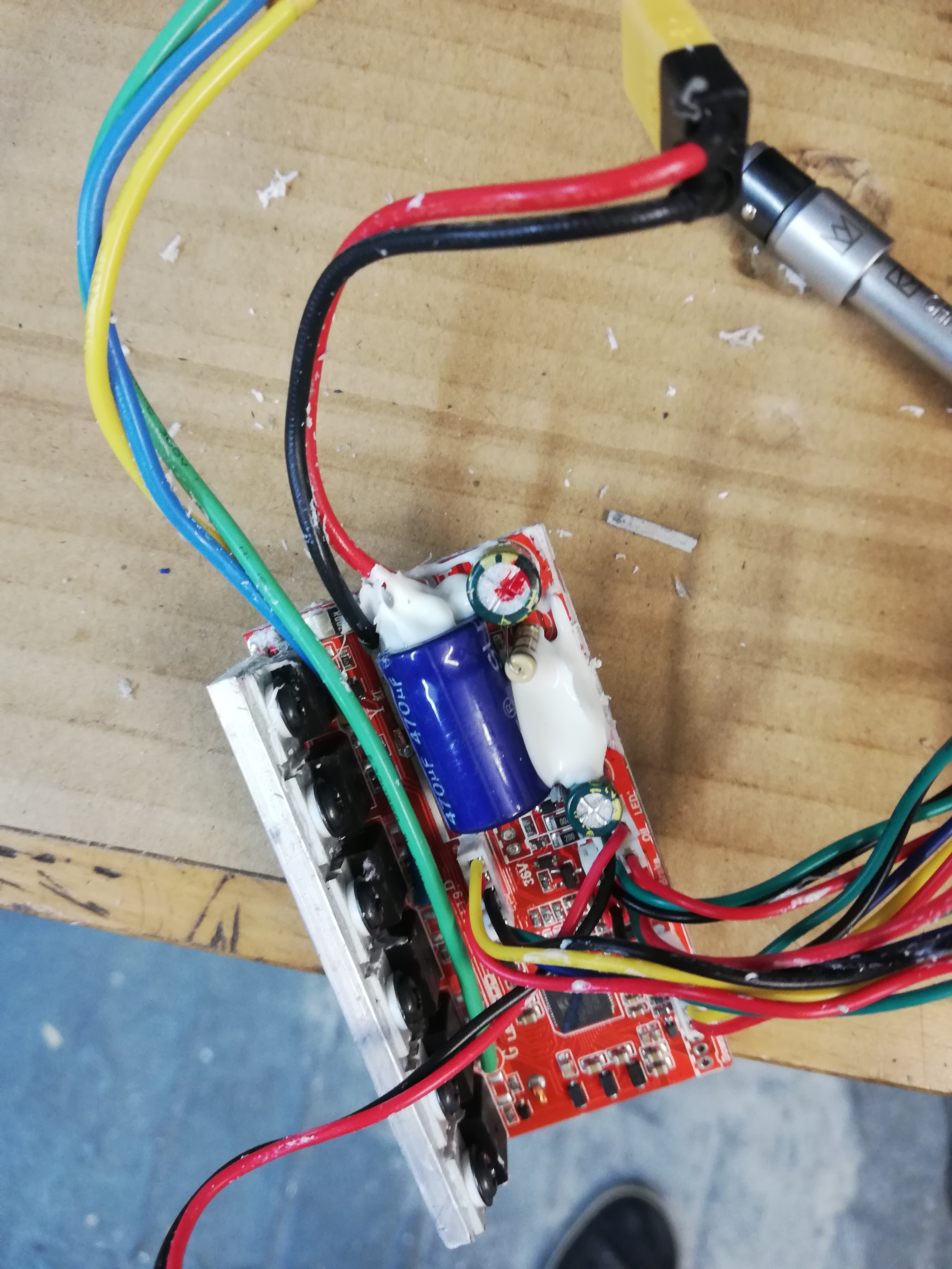 danke für die schnelle Antwort. Habe mal versucht den Controller auszubauen. Das sieht mir so aus, als wenn der Stecker am Motorkabel ein bisschen zu heiß geworden und geschmolzen ist, oder täusche ich mich da? OK, jetzt ist es eindeutig: den Elko hats verrissen. Mal schauen ob ich noch einen 470nF Elko habe, dann löte ich nen neuen drauf.