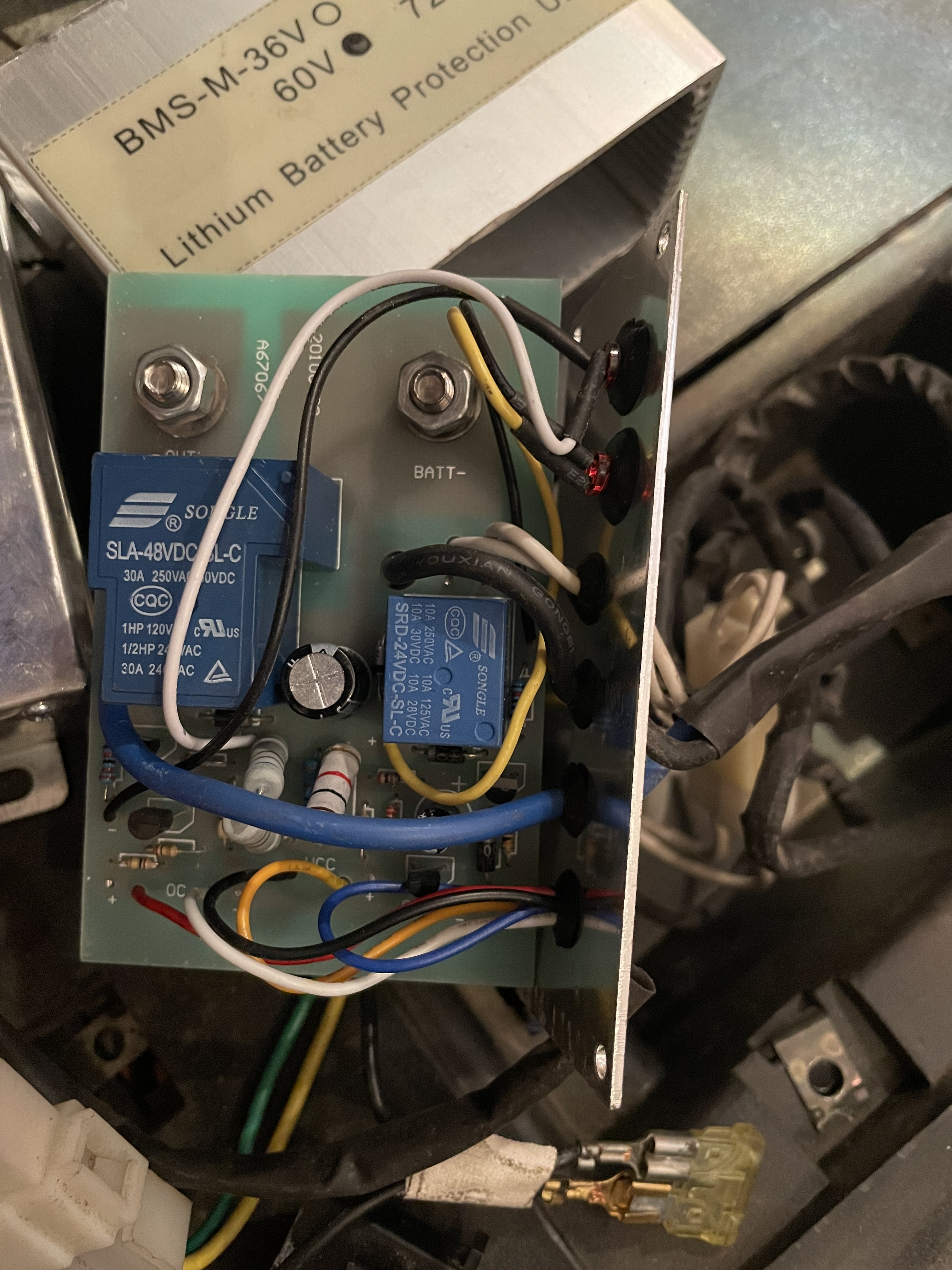 Ich habe auch das Innenleben des Kästchens fotografiert. Das größere Relais trennt die Masse des Ladegeräts, das kleinere trennt/verbindet einen Eingang des Motor-Controllers mit/von den 60V Batteriespannung.