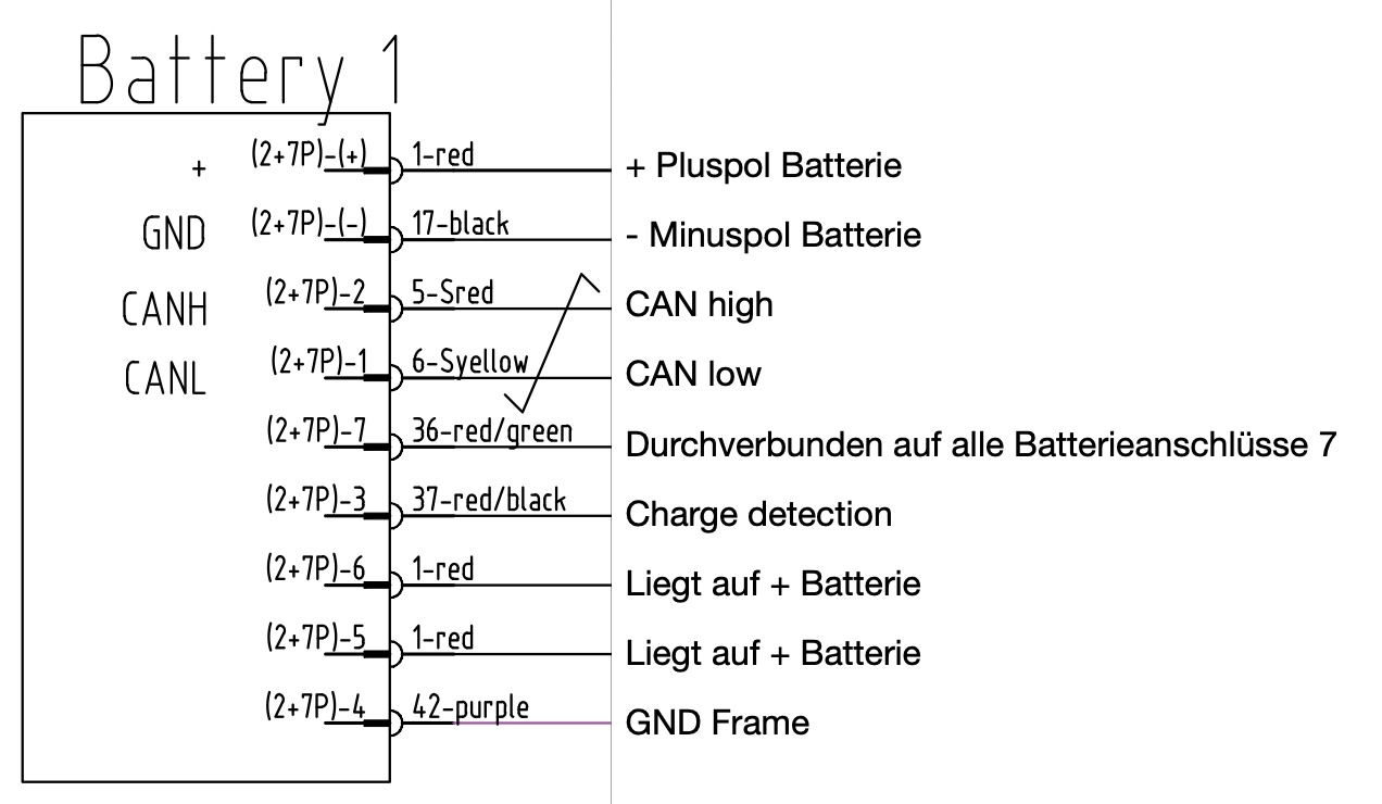 Mit Plus und Minus auf den dicken Stecker/Buchsen-Pins schaltet der E300SE also (normal) EIN. Soweit so gut!. Es ist aber keine RS485 / CAN-Kommunikation zum Fahrzeug aktiv. Über die läuft normalerweise die Übertragung des Akku-Füllstandes (ermittelt vom BMS) an das Fahrzeug und dessen Display.