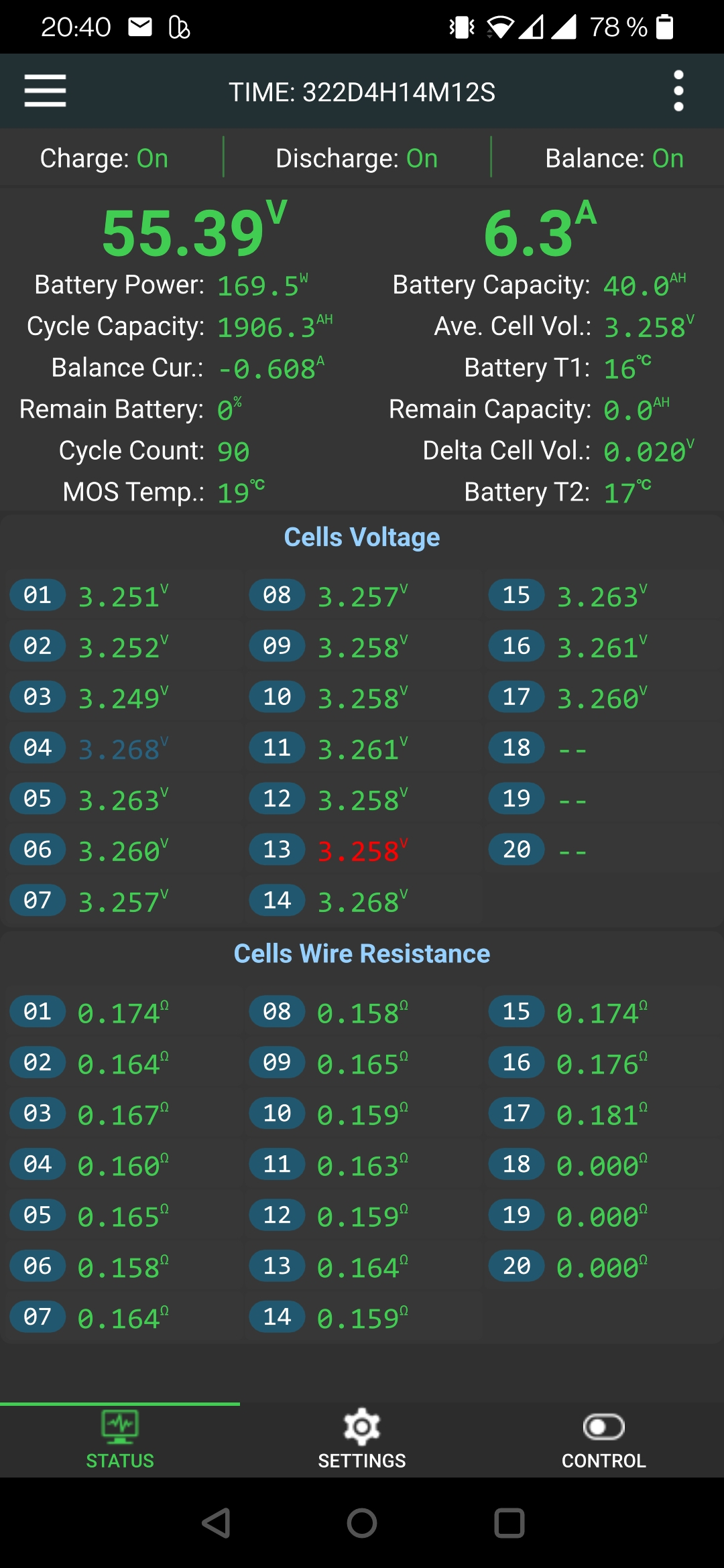 Vermutlich mißt das JK BMS Active Balancer BT mit den Cells Wire Resistance die Innenwiderstände der Zellen. Man kann wohl eine Alterung der Zellen erkennen. Ab 0,75 werden die Zahlen gelb und es geht kaum noch etwas....