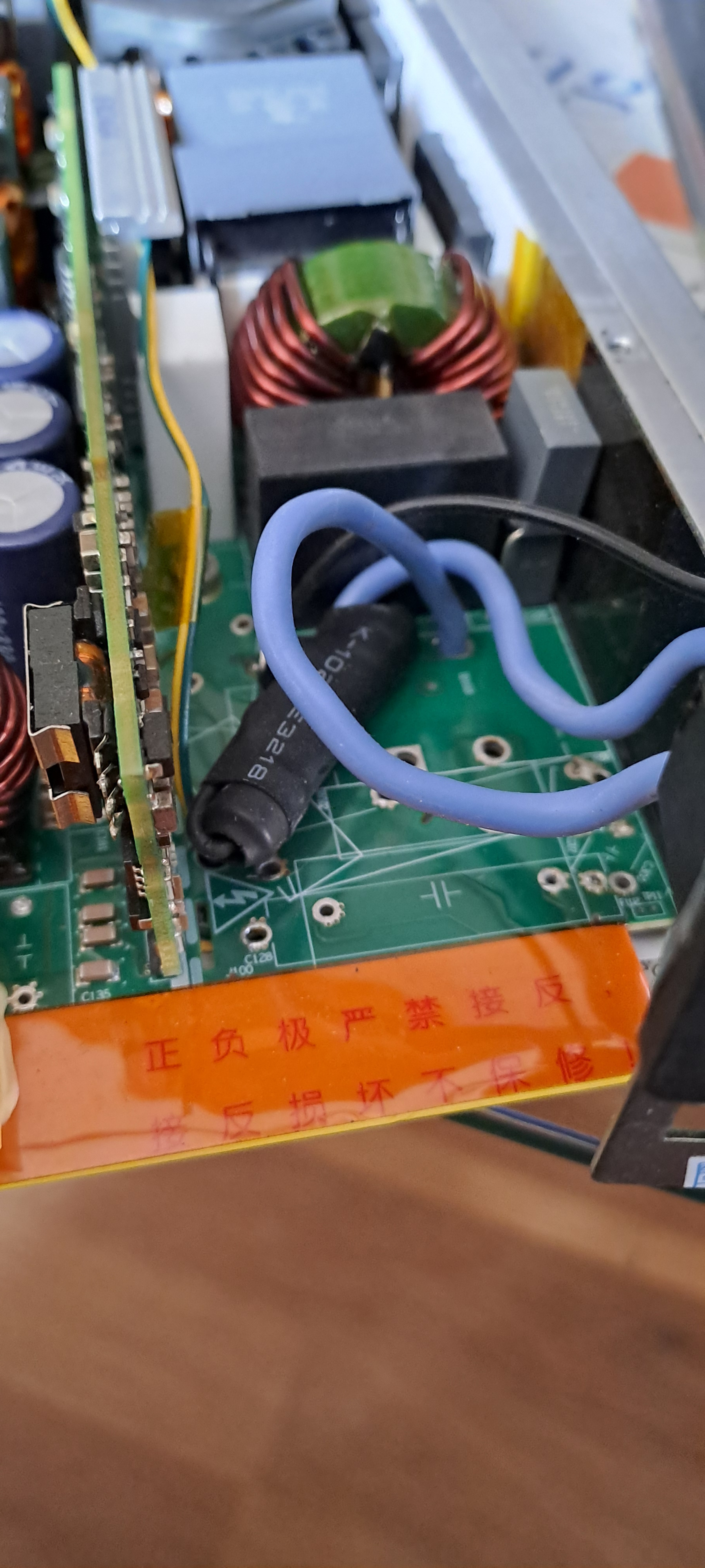 Die Änderung intern ist komplett anders realisiert als bei meinem vorherigen. Es gibt sichtbar nur 2 Leitungen welche in das Gerät eingreifen, vermutlich der CAN-BUS. Die Anpasssung der Spannungs- und Strommessung wie auch der geänderte Ausgangstrafo sowie die Elkos sitzen auf der originalen Huawei Platine.