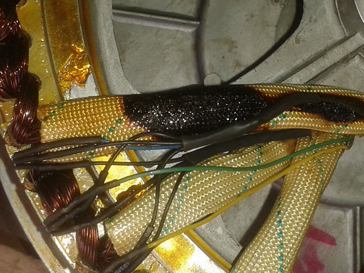 Dannach wird das lose Lagerschild vorgewärmt und über das zweite Lager mit leichten Hammerschlägen in Position gebracht und mit dem Rotorgehäuse (Glocke) verschraubt. In China wird es entsprechende Zentriervorrichtungen geben oder auch nicht, weil die Gummihammermethode die schnellste ist.