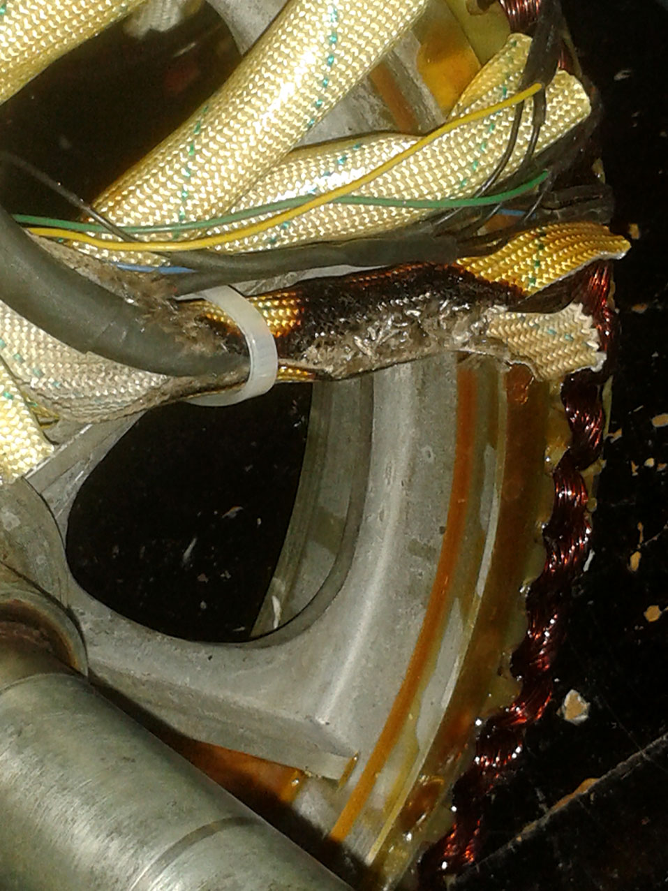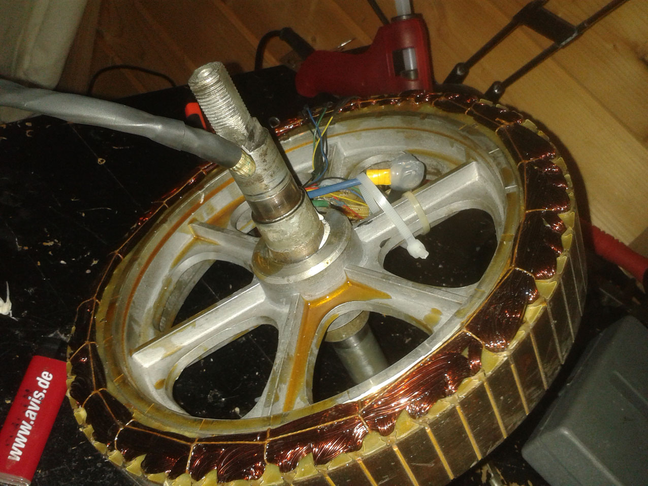 Durch eine schlechte Verbindung zwischen Rotorwicklung und Phasenkabel war dieses bis in die Nabe des Rotors verbrutzelt! Habe das Verschmorte der Wicklung weggekratzt bis zum blanken Kupfer. Ein Stück Kupferkabel 6mm angelötet, mit dem neu verlegten Phasenkabel (Blau) mit Ringschuhverbinder verschraubt. Mit Heisskleber
