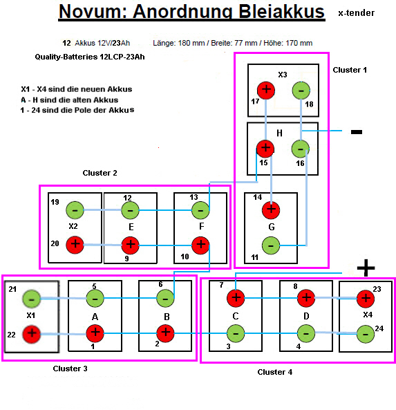 Gut 'rankommen wirst Du nur an X1,X2,X3 und X4. Also 21 und 22, 19 und 20, 17 und 18 sowie 23 und 24 auf eine Lüsterklemme mit 1,5 mm² Kabel legen. Ob in die in alle 8 Leitungen eine 10A Sicherung gelegt wird, muß jeder für sich selbst entscheiden. An der Lüsterklemme kannst Du die einzelnen 12V Blöcke nachmessen und gegebenenfalls einen 12V Block mit dem Labornetzgerät nachfüttern.