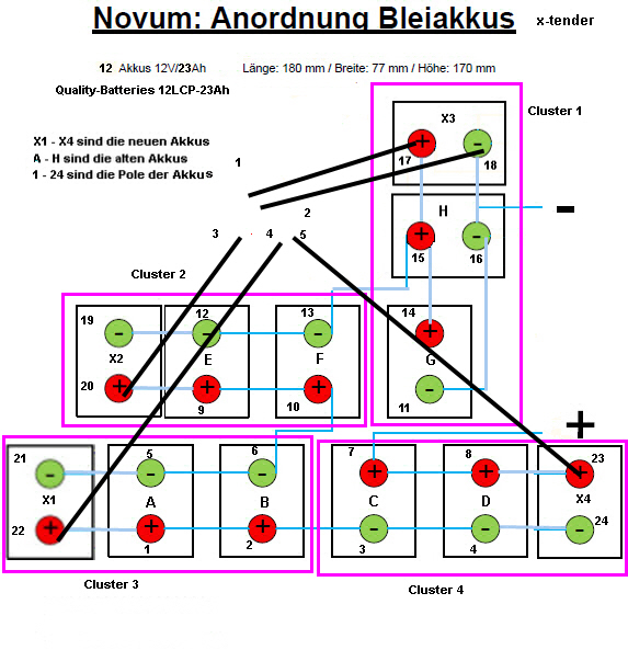 Bei X3 ist wohl ein satter Kurzschluß gezeichnet......... Auch Kabellängen und Übergangswiderstände spielen bei der 5 Kabelversion eine Rolle. Richtig wäre bei 0V (Masse) anzufangen und dann auf die nächsten Pluspole der cluster zu gehen. Ergibt dann von 0V (Masse) aus gemessen 12V, 24V, 36V und 48V.
