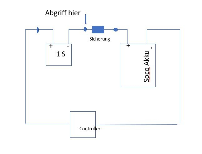 im Moment sind die zwei Punkte " Abgriff hier " mit Steckern XT-60 verbunden. Der 1S ( auch mit XT60 versehen ) wird eingeschleift. Wenn er wieder abgezogen ist, kann ich die Punkte wieder normal verbinden über die Stecker.