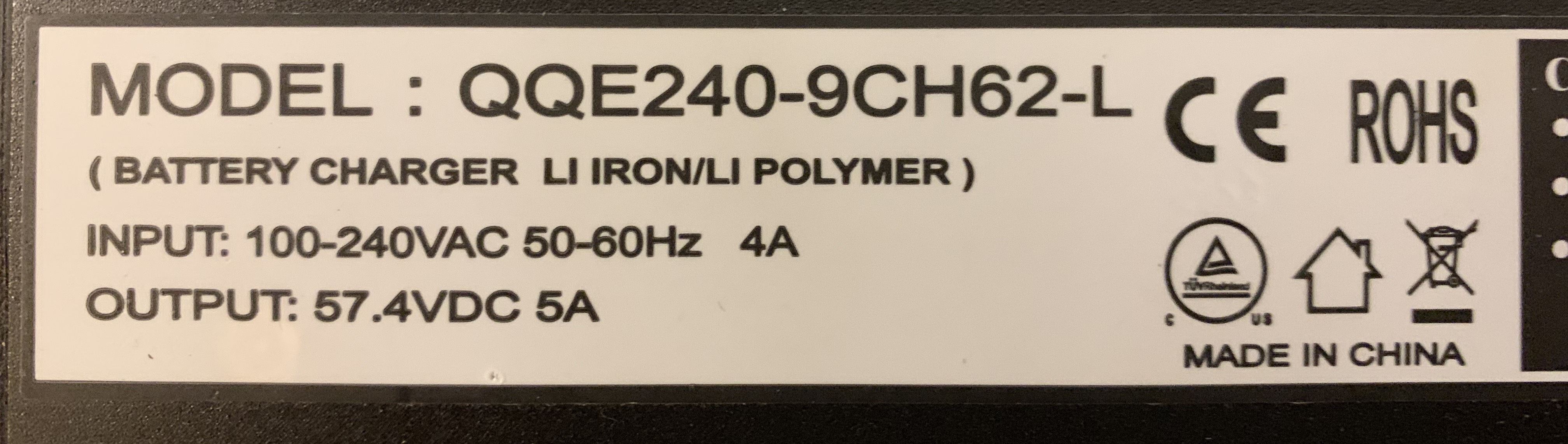 Auf dem Ladegerät von unu steht beispielsweise "INPUT: 100-240VAC 50-60Hz 4A" und "OUTPUT: 57.4VDC 5A".