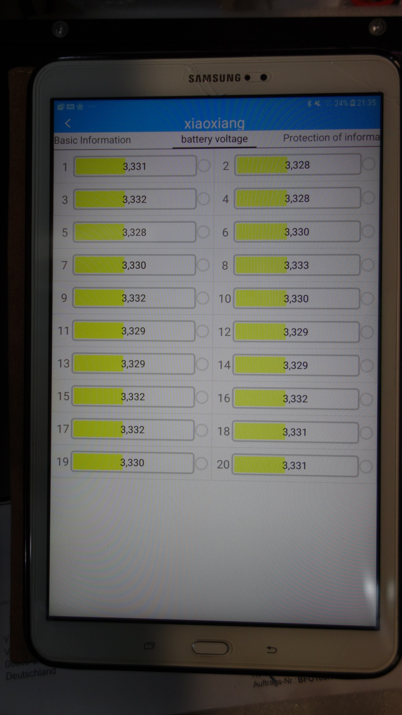 Der Akku ist noch einwenig debalanciert. Deswegen erreichst du auch keine 72V. Leider hat das JBD/Xiaoxiang BMS nur einen geringen Balancerstrom von 35mA. Jedenfalls hat die Abschaltung durch das BMS bei 3,6V, Zelle 3, funktioniert. Vermutlich wirst du, auch nach mehreren Ladevorgängen, nur auf 70V Ladeendspannung kommen. Das ist aber nicht schlimm - ist halt bei einem LFP-Akku so.