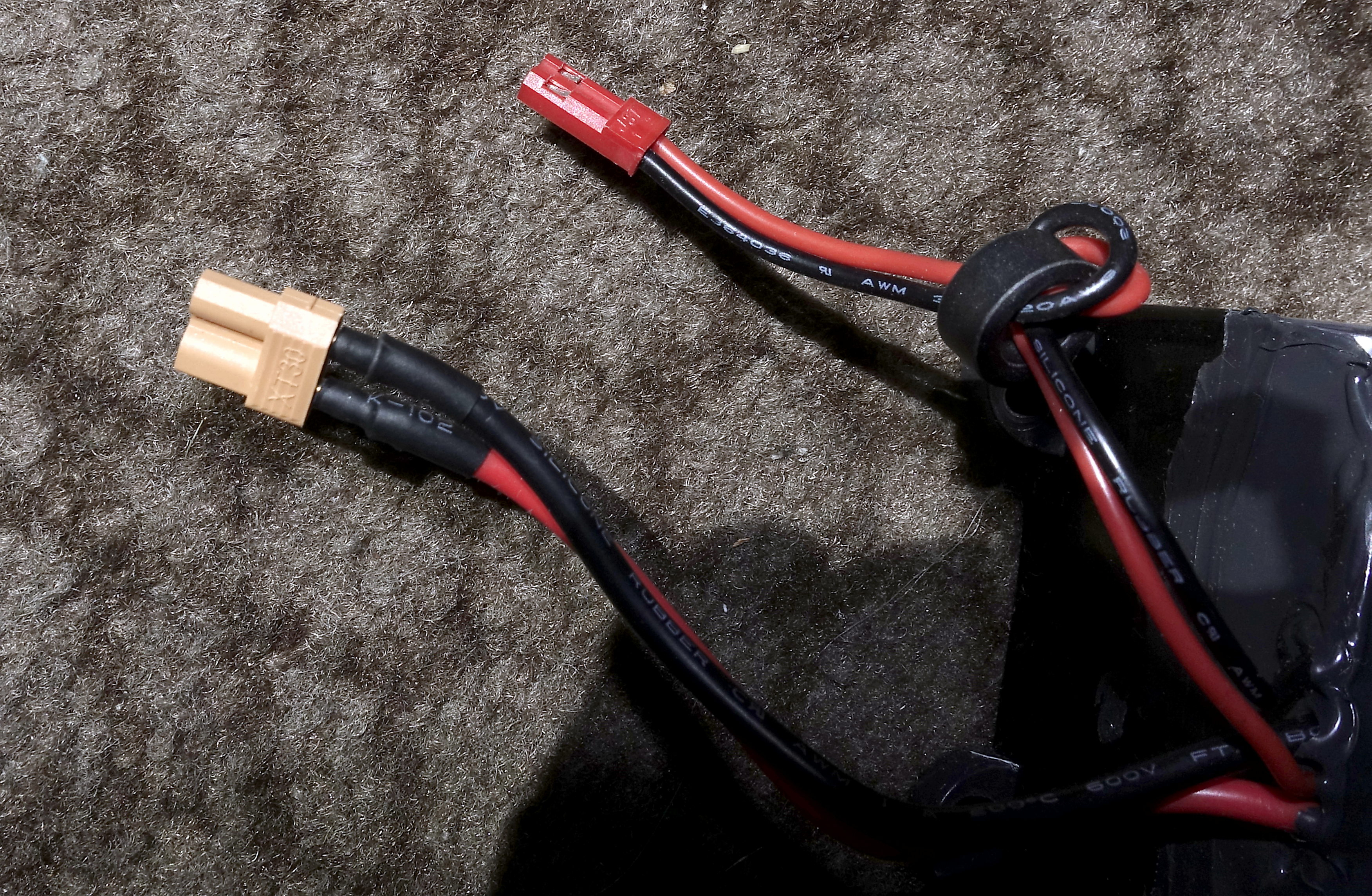 Eine mit einem XT30 Stecker (Strom für den Motor) und einen kleinen roten (JST) Stecker (siehe Bilder).