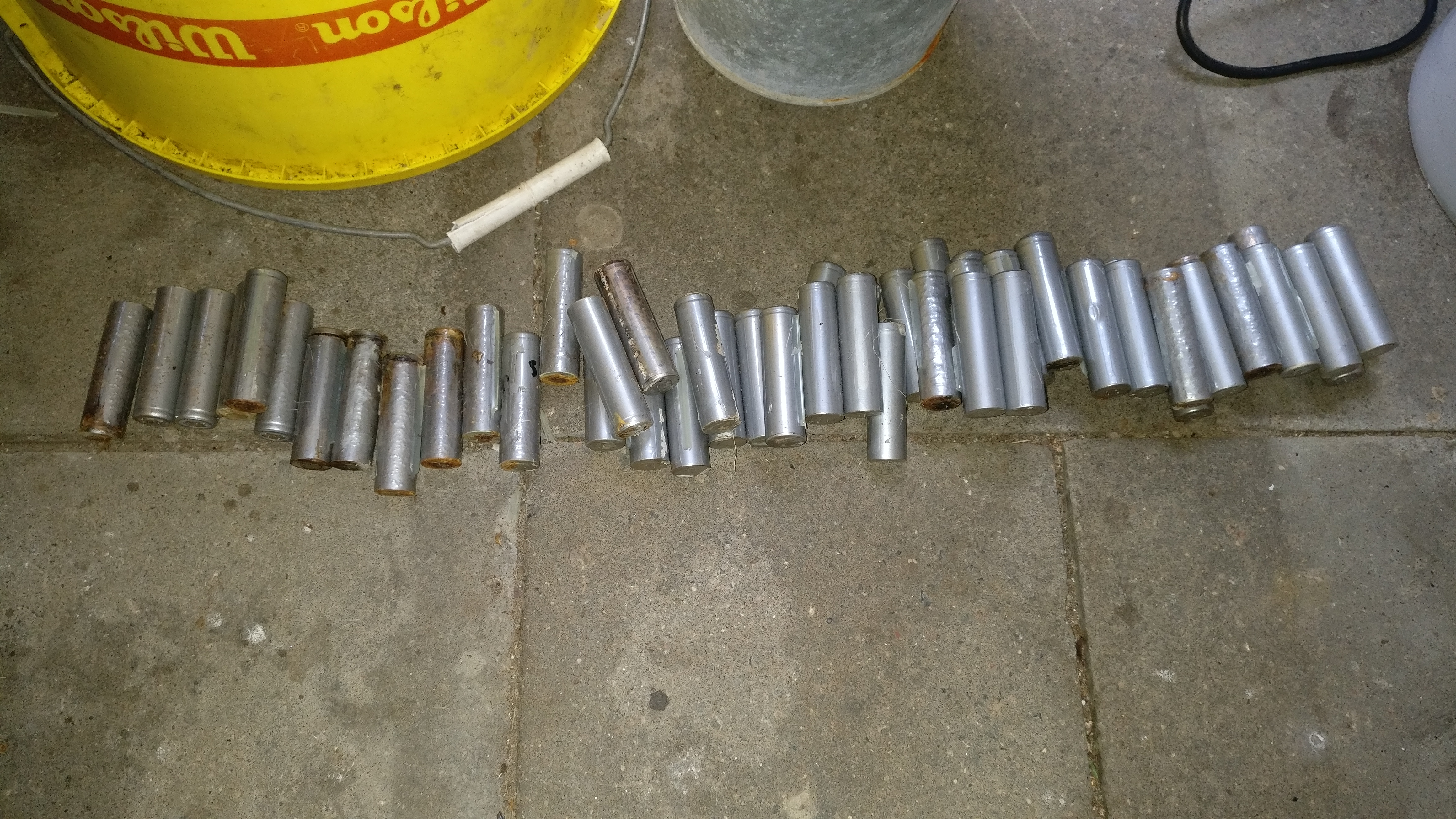 Von den 72 Zellen hatten 20 gut Ausschlag in alle Richtung und Rost. Ein paar hatten um die 0,8 V, ein paar sogar 1,7 bis 2,2V. Ende vom Lied, ich habe 18Stück mit 3,76 V und der Rest geht in die Tonne. Aus 2 alten Laptopakkus könnte ich auch noch 6 von 24 Stück retten.