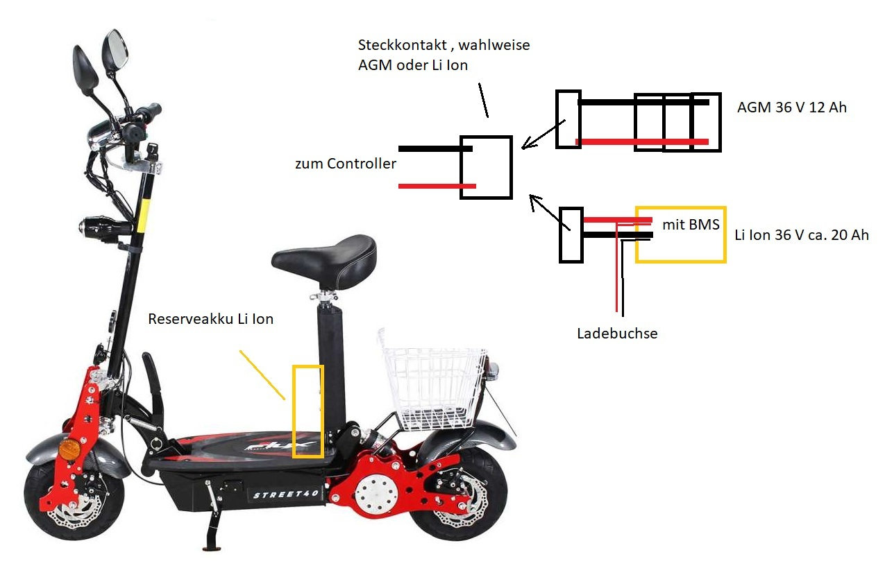 Falls im Fahrzeug eine Ladebuchse vorhanden war, kann man die dann aber nicht mehr nutzen (da Laden dort nicht überwacht wird). Ggf. wird das lästig, immer diesen separaten Ladezugang herauszukramen, wenn man aufladen will. (Natürlich kann das alte Ladegerät für Blei am Lithium-Ionen-Akku ohnehin nicht mehr verwendet weden. Aber der Umbau des alten Ladesteckers auf das neue Ladegerät macht nur Sinn, wenn der Ladezugang BMS-überwacht erfolgt)