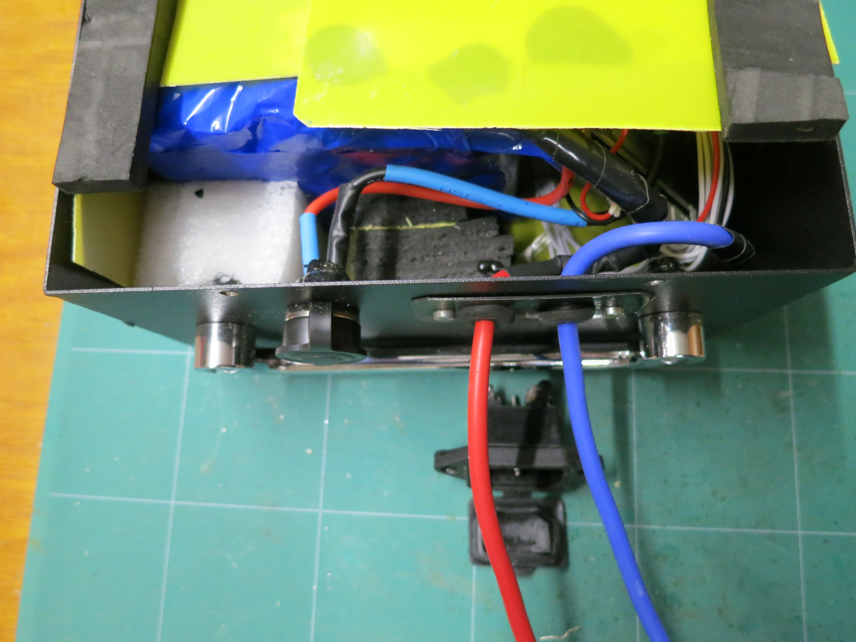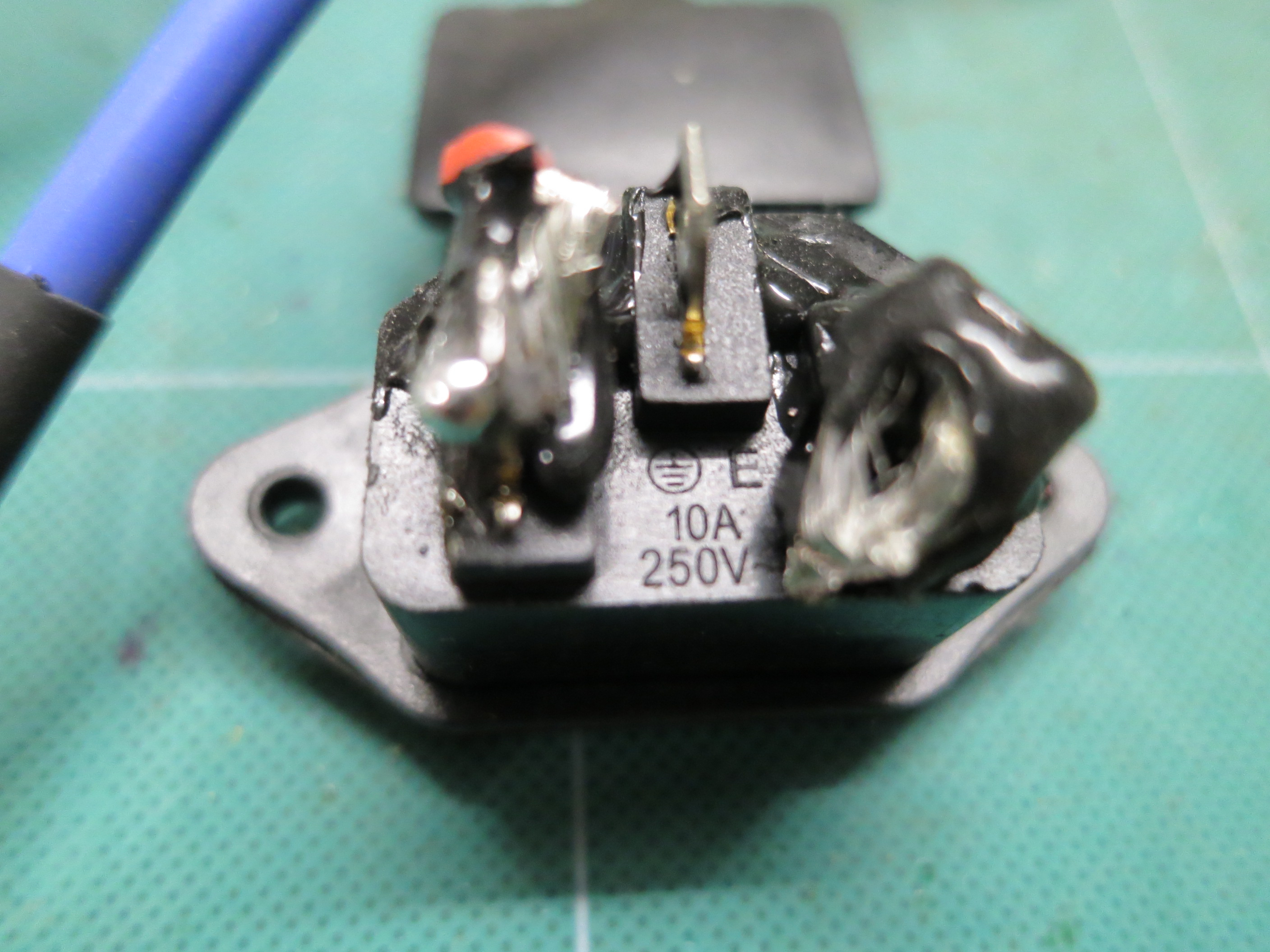 Also musste die Kaltgerätebuchse ausgebaut und die Kabel verlängert werden. Ich habe Silikonlitze mit 6 mm² Adernquerschnitt genommen und mit Verbindungshülsen gecrimpt und gelötet. Gut, dass die Isolierung aus Silikon ist, denn ich musste den Lötkolben länger draufhalten bis das Lot geschmolzen war. Der dicke Adernquerschnitt hat die Wärme stark abgeleitet und den Schrumpfschlauch in 5cm Entfernung zusammenziehen lassen.