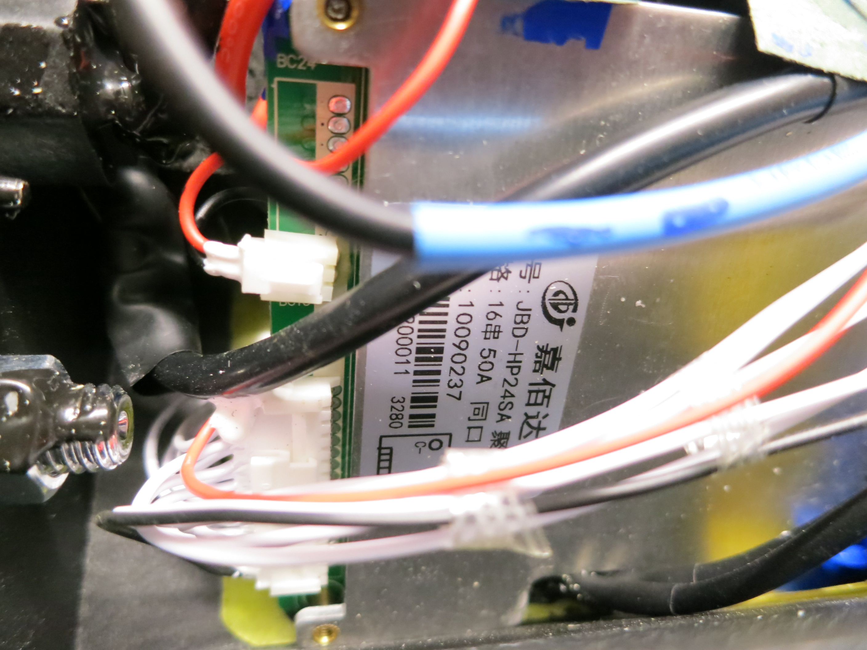 Sollten hier ursprünglich tatsächlich die 50 Ampere, die das BMS hier offenbar tolleriert, durch diese für 10 Ampere ausgelegte Steckverbindung geschickt werden? Aber auch die andere Buchse hätte wohl keine dafür geeigneten Kabel.