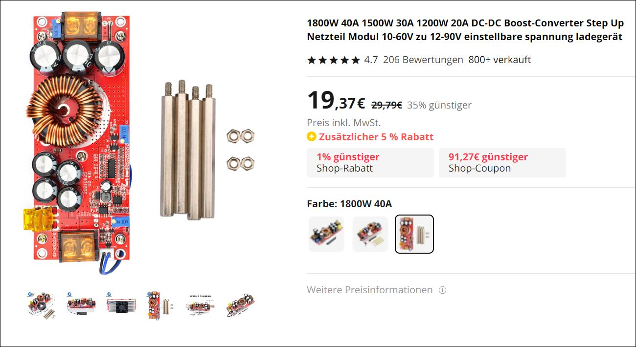 Wenn ich das als Laie richtig verstanden habe, ist nach aussage der Vorredner der gezeigte ein Wandler , der 12 Volt auf 60 Volt "aufbläht", als bei einem Auto aus 12 V xx Volt machen kann, slso der falsche...dagegen spricht, daß conny-r schreibt, er würde sigar "72 Volt Eingangsspannung" schaffen. Bin nun auch verwirrt. Tja , wenn Leute vom Fach fachsimpeln...