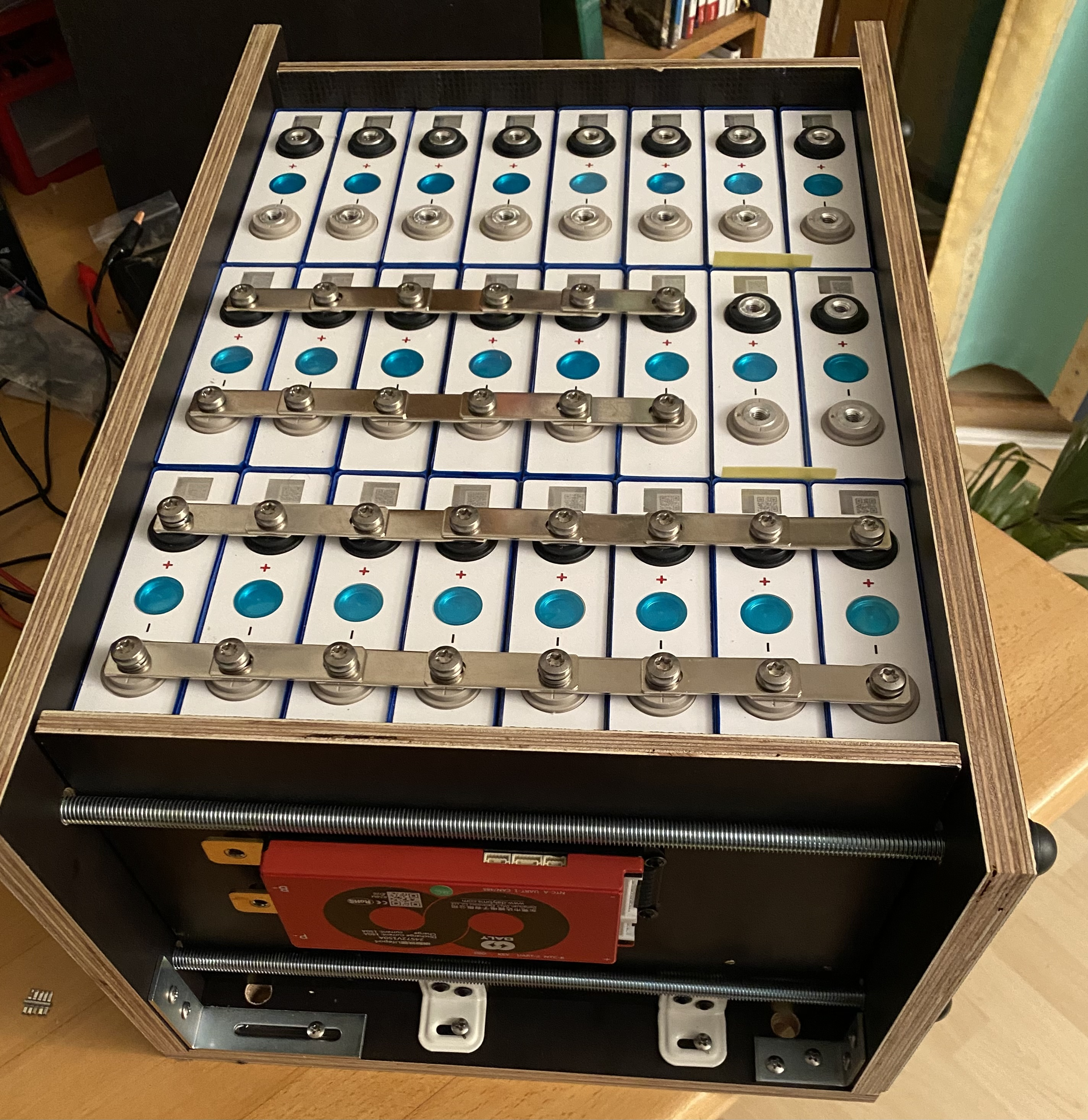 Die LiFePO4-Blockzellen in meinem Roller von 2010 waren bereits mit Metall-Rahmen fest verspannt, um das Ausbauchen zu verhindern. Bei den jetzt hier Verwendung findenden Zellen (von denen ich die 105Ah habe) ist das immer noch der gleiche Effekt, dass die über die Benutzung einen "Bauch" bekommen, wenn man das nicht eindämmt.