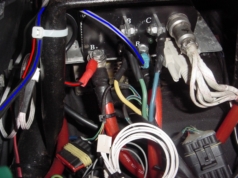 Direkt am Controller gehen die 4mm² Kabel für den 72V Aux-Ausgang im Helmfach weg. Blau gekennzeichnet ist Minus. Das zugehörige rote "Monsterkabel" kommt Cycle Analyst Shunt und Batterie-Minus, d.h. bei eingeschaltetem CA zählt dieser die über den Aux-Ausgang abgegriffenen Ah mit.