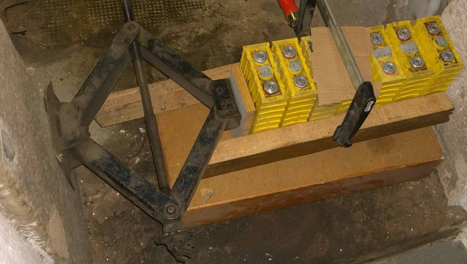 Irgendwie bräuchten wir doch eher einen Monster-Schraubstock für diese vermaledeiten vierer-Blocks, da die Kraft selbst von zwei Schraubzwingen nicht wirklich ausreicht, vier Zellen mit ganz leichtem Bäuchlein per Alu-Endplatten so weit zu plätten, dass die Serien-Stahlbänder spannungsfrei angeschraubt werden können