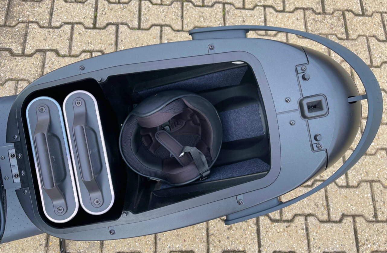 UNU Scooter Pro , hat einen Monster-helmfach. Zwei Akkus UND zwei Helme. 40 Liter.