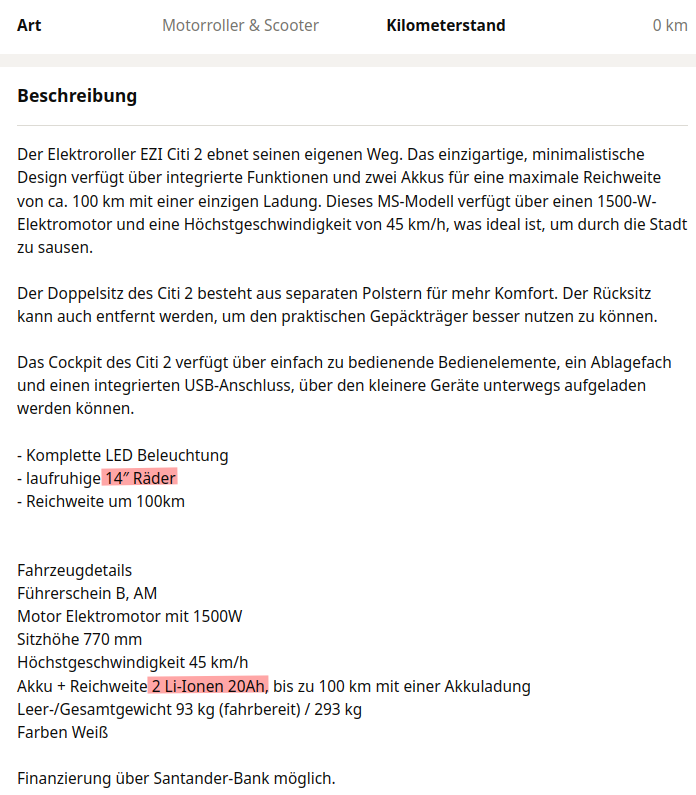 Akkuspannung als fehlende Info haben schon die Vorposter erwähnt, ebenso die 1500W, die ich am unteren Ende in der AM-Klasse sortiere. Die reale Reichweite würde ich eher auf 40 - 60km einordnen, bei angenommenen 48V. Bei 60V legen wir ein paar Prozent drauf, also 2,4KWh, kann also für 50 - 65km reichen.
