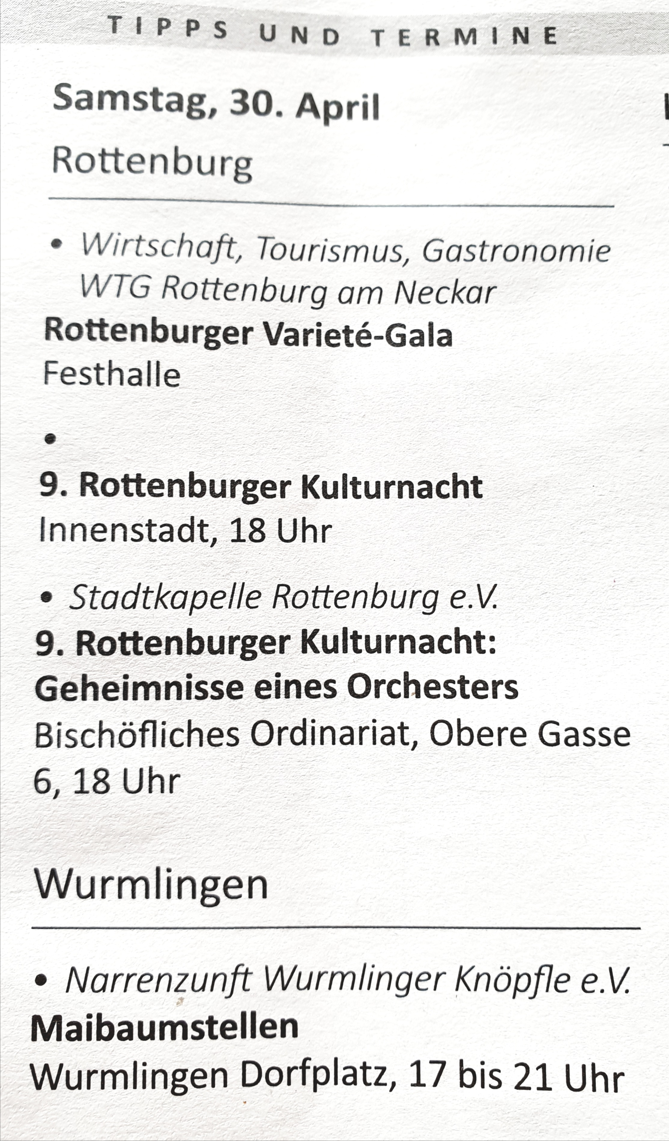 14h Christl. Gottesdienst (überkonfessionell) mit live Band, rockige & softe Lieder, anschließend Sengnung der Fhz (und wer dabei steht und nicht wegguckt😄), dann 2x Stadtrunde - da gehen wir silence leider akustisch unter, es sei denn: mit-tröten! - und Fahrt zum Hock beim Freibad, Richtung Bad Niedernau.