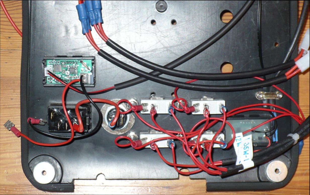 Hier noch ein Foto von der Rückseite des 'Zwischenbodens' (unter dem Sitz über dem Controller), an dem die ganzen Schalter, Meßgeräte, usw. angebracht sind, was es Dir hoffentlich leichter macht, mir beim richtigen Anschliessen zu helfen: in der Mitte links ist das Amperemeter, da drunter der Wippenschalter und rechts davon der Stecker für das externe Netzgerät (der Minuspol vom Stecker ist rechts).