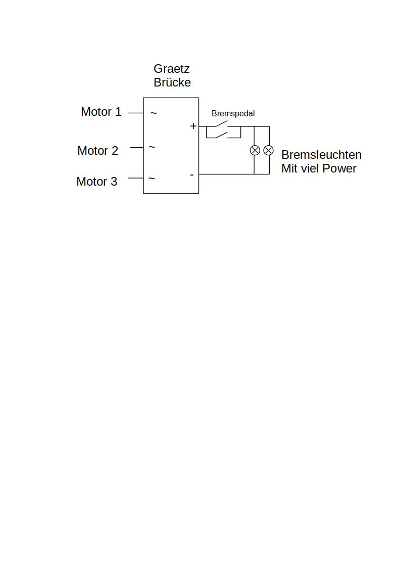 Genau du schaltest die Graetzbrücke mit den 3 Wechselstromeingängen parallel zu den dicken Motorkabeln. Die Glühbirnen hatte ich nur als Idee da man sie auch gleich als Bremslicht verwenden könnte. Das könnten schon normale Haushaltsglühbirnen sein bloß die Bauform ist nicht so toll.. Wieviel Leistung bei welcher Spannung entsteht kann ich nicht vorraussagen. Hängt auch an Geschwindigkeit und Gewicht deines Autos.. Ich würde mal schauen was im Haushalt so rumliegt und das dann ausprobieren. Rein theoretisch könnte man den Strom auch in die Batterie zurückspeisen aber da bin ich mir nicht sicher was passiert wenn man Bremse und Gas gleichzeitig betätigt und ob die Batterie den eventuell hohen Strom verkraftet.