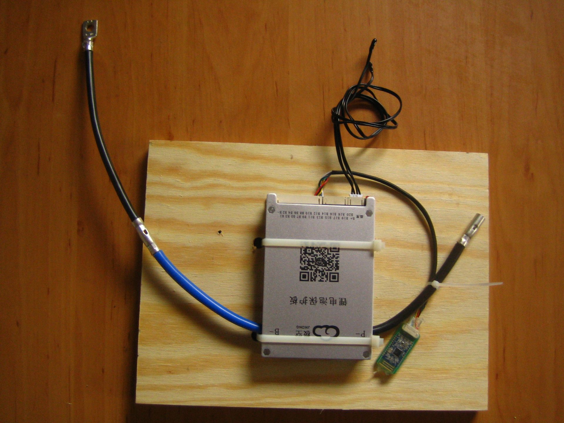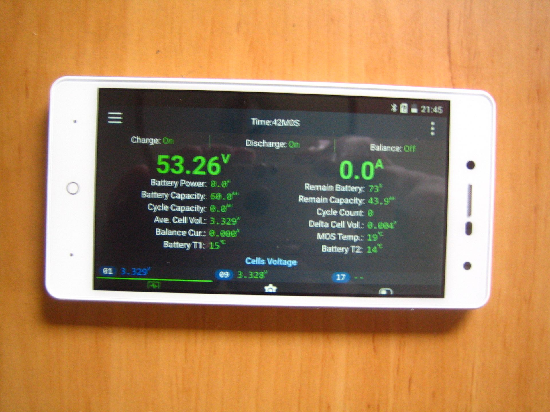 Um den 20 März herum war das 60A Jikong BMS eingetroffen. Es ist kleiner als die 100A, 150A oder 200A Version: 80 * 110 * 17mm. Es unterstützt 15 bis 17 LFP4 Zellen bzw. 13 bis 15 Li-ion Zellen https://de.aliexpress.com/item/10050018 ... 1835qulyRT Vor 1 bis 2 Jahren habe ich mir 10mm Sperrholz in den Maßen 260 * 195mm zusägen lassen. Ein solches Brett kam wieder zu Einsatz: Wie man sieht, ist beim kleinen Jikong BMS der Bluetooth Adapter extern. An die dicken Kabel B- und P- bin ich mit Stoßverbindern gegangen. B- geht zum Minus der Batterie und P- zum Minuspol des proud eagle Controllers - 45A dauernd sowie 80A mit der Boosttaste für 120sec. Der QR Code für die App ist auf dem Gehäuse. Nach Eingabe des password kann man LiFePo4 anwählen sowie die Zellenanzahl eingeben. Dann ist man mit der Basiseinstellung schon durch - meine 75Ah Zellen sind hier noch nicht eingestellt. Die Ports Discharge und Charge sowie Balance sollten eigentlich immer auf ON sein.
