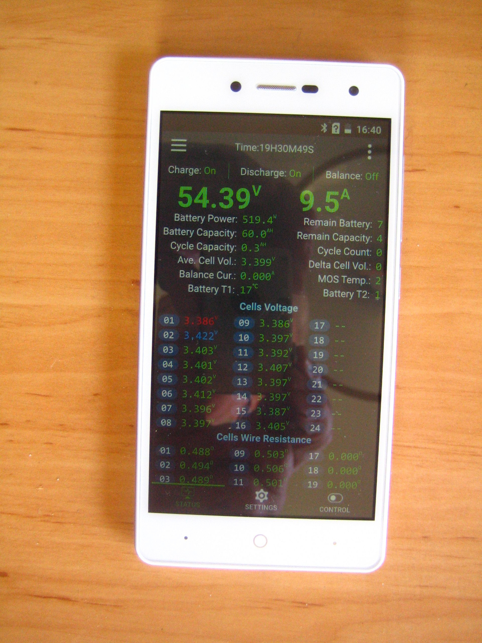 Kommt beim Laden eine Zelle über 3,6xV geht der Charge Port auf OFF. Ist die Zellspannung kleiner 3,4xV geht er wieder auf ON. Erreicht eine Zelle beim Fahren 2,8 bis 2,5V geht der Discharge Port auf OFF und man muß den Roller schieben....... Es wird der Ladestrom, hier 9,5A, als auch der Entladestrom angezeigt bis 100A?