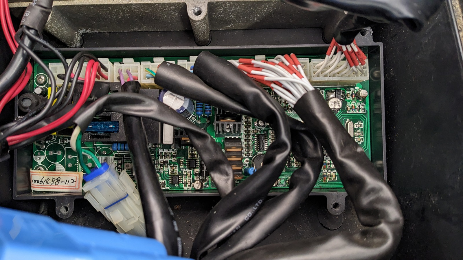 Neben dem blauen SB50 Anderson Ladestecker im Helmfach gibt es noch eine SB50 Verbindung zwischen Batterie und Controller. Auf der ersten Batterie sitzt eine 50A ANL-Sicherung im Gehäuse. Der Sevcon Gen 4 Controller wurde 2010 eingeführt. Anfangs Size 4, danach Size 2.