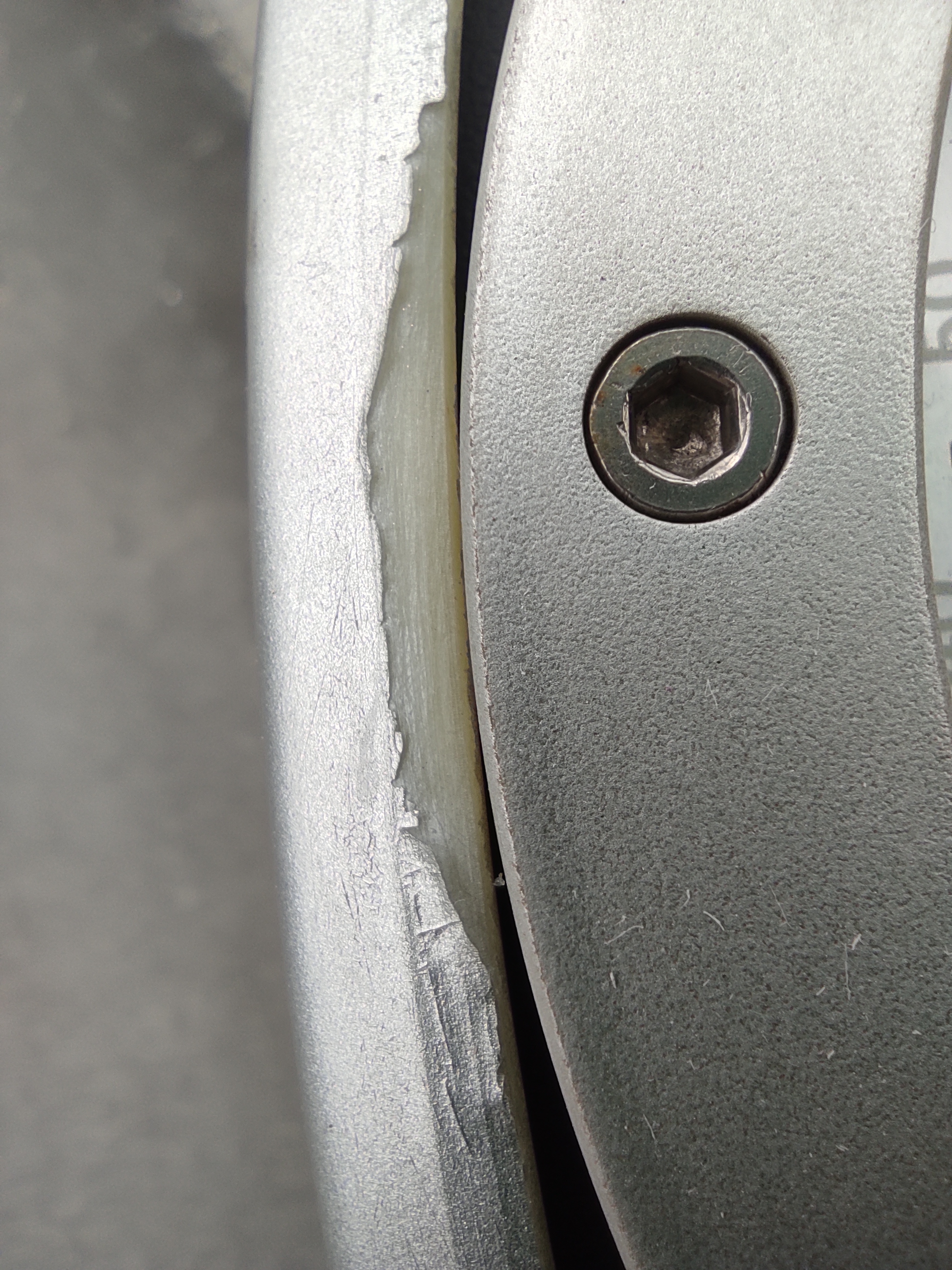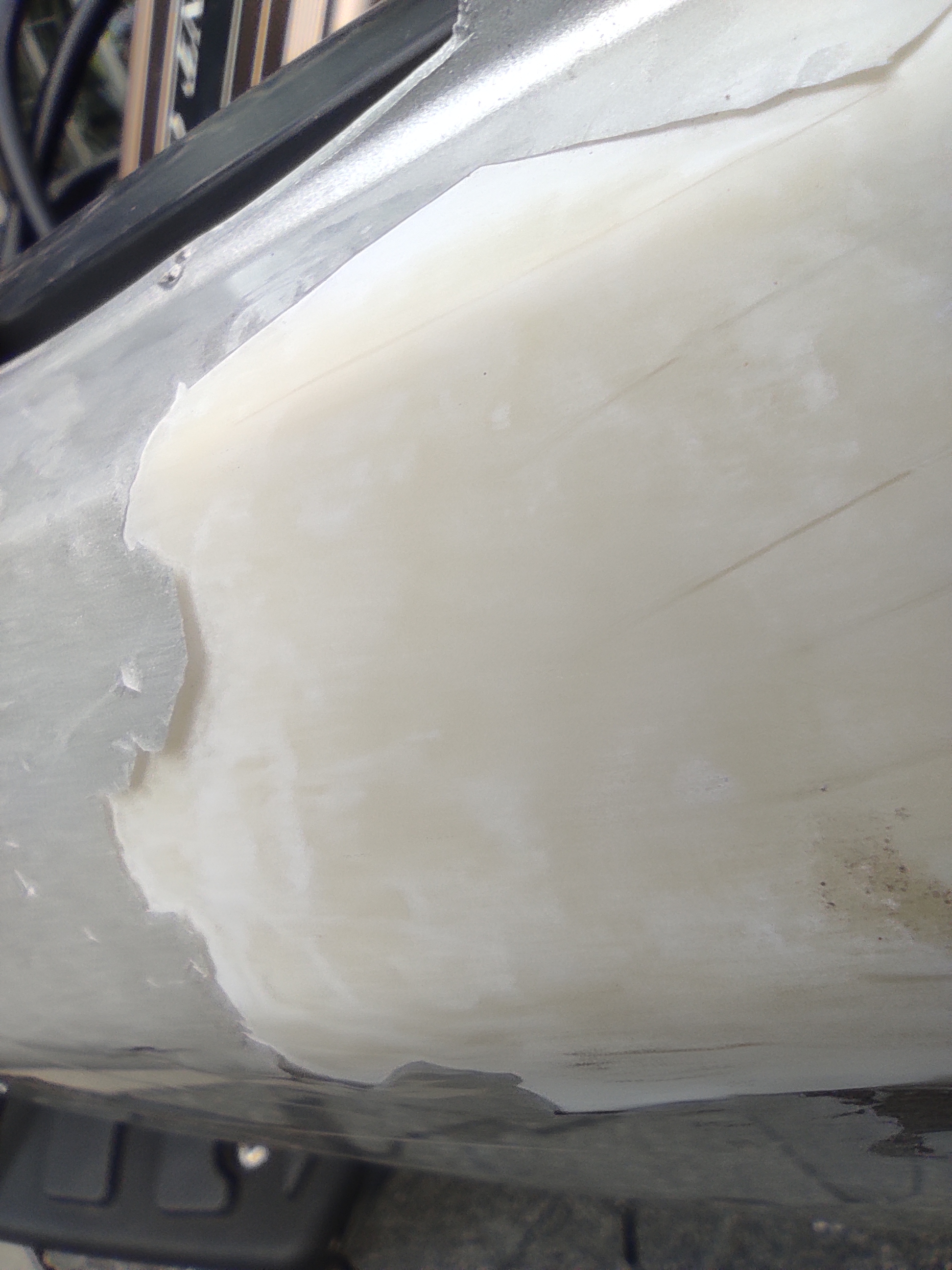 Bei meinen 2010er E-Mäxen tritt unter dem abgeplatzten Lack ein weißer Kunststsoff zu Tage. Sieht aus wie Fiberglas.