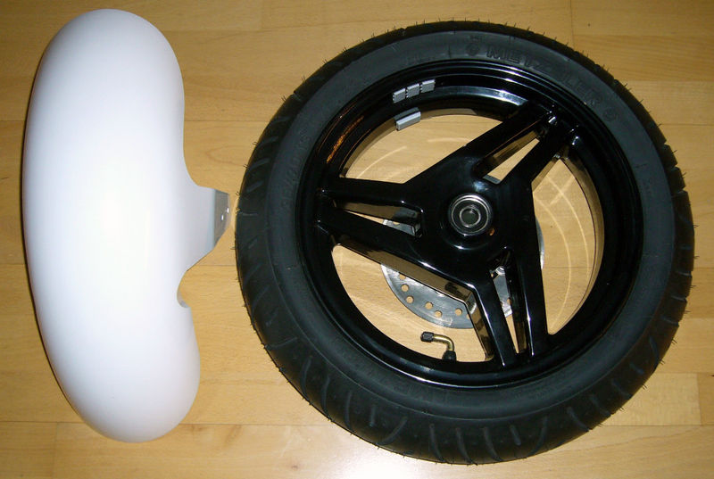 Bilder vom statisch gewuchteten 13" Vorderrad sowie Schlauch stelle ich Weihnachten ein. Beim Vorderrad gibt es doch  zwischem einem Elektro- und Benzinroller wohl keinen Unterschied: Bremsklötze ausbauen und Steckachse ziehen und schon hält man das Vorderrad in Händen. Leider ist ein E-Max 90S kopflastig und wiegt auch 151kg. Gegebenenfalls unten die Verkleidung (Wanne) abbauen und den Batteriekasten mit einem Wagenheber abstützen...
