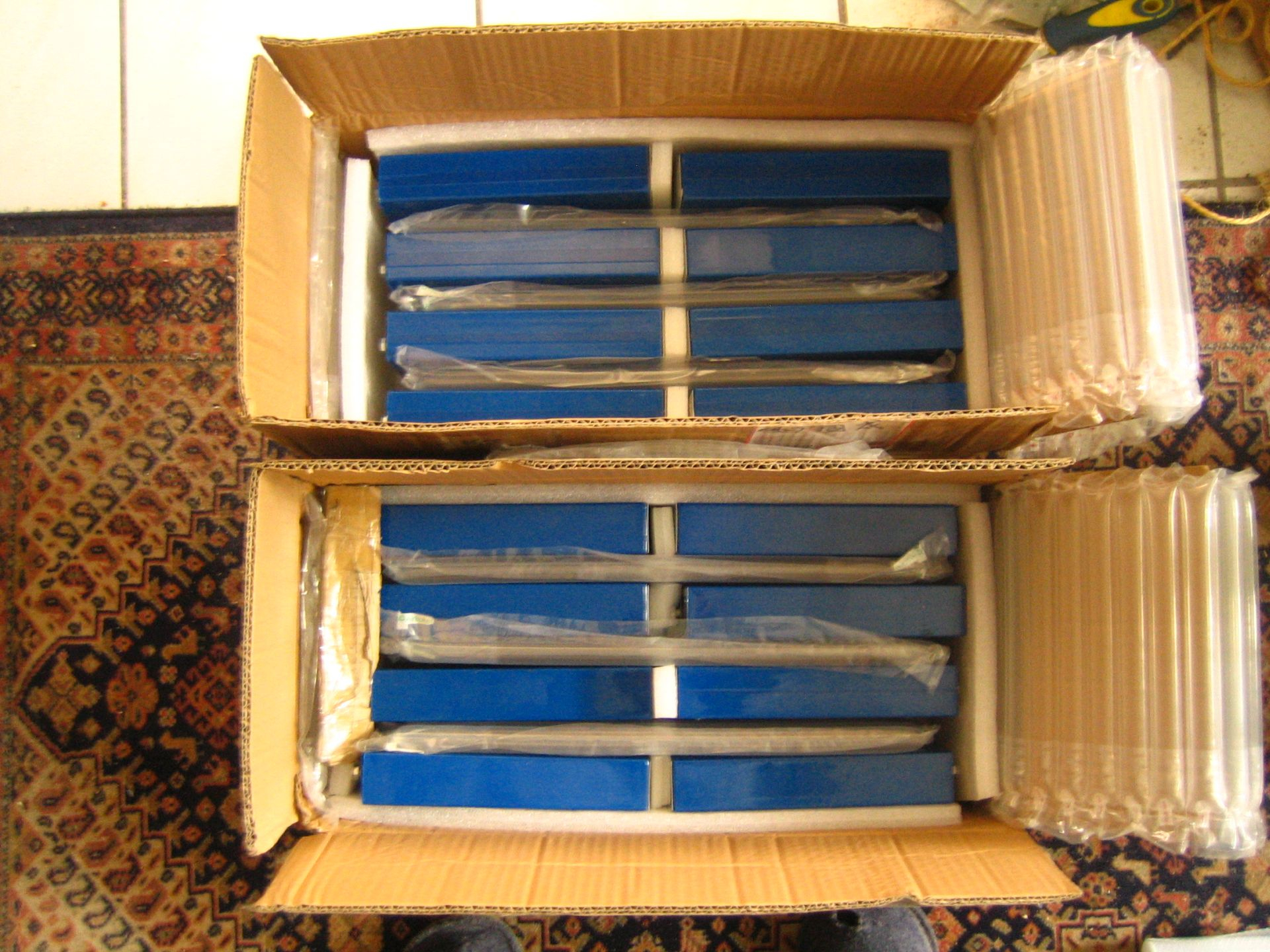 Im März schwächelte mein Greensaversatz 48V 60Ah C5. Darauf entschloß ich mich, 16 Stück 100Ah GTK LiFePo4 Zellen bei aliexpress zubestellen. Nach 8 Wochen Wartezeit - wegen Seefracht 2 * 16kg - war Anfang Juni der große Tag gekommen und UPS brachte 2 Pakete: Die Zellen sind hochkant und mehr oder minder einzeln verpackt.