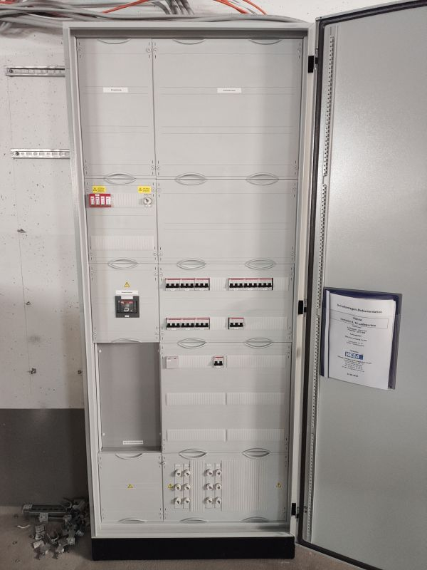 Straße aufgebuddelt für den Hauptanschluss und der Schaltkasten für die Wallboxen ist riesig, jetzt noch fast leer. (Siehe Bild)