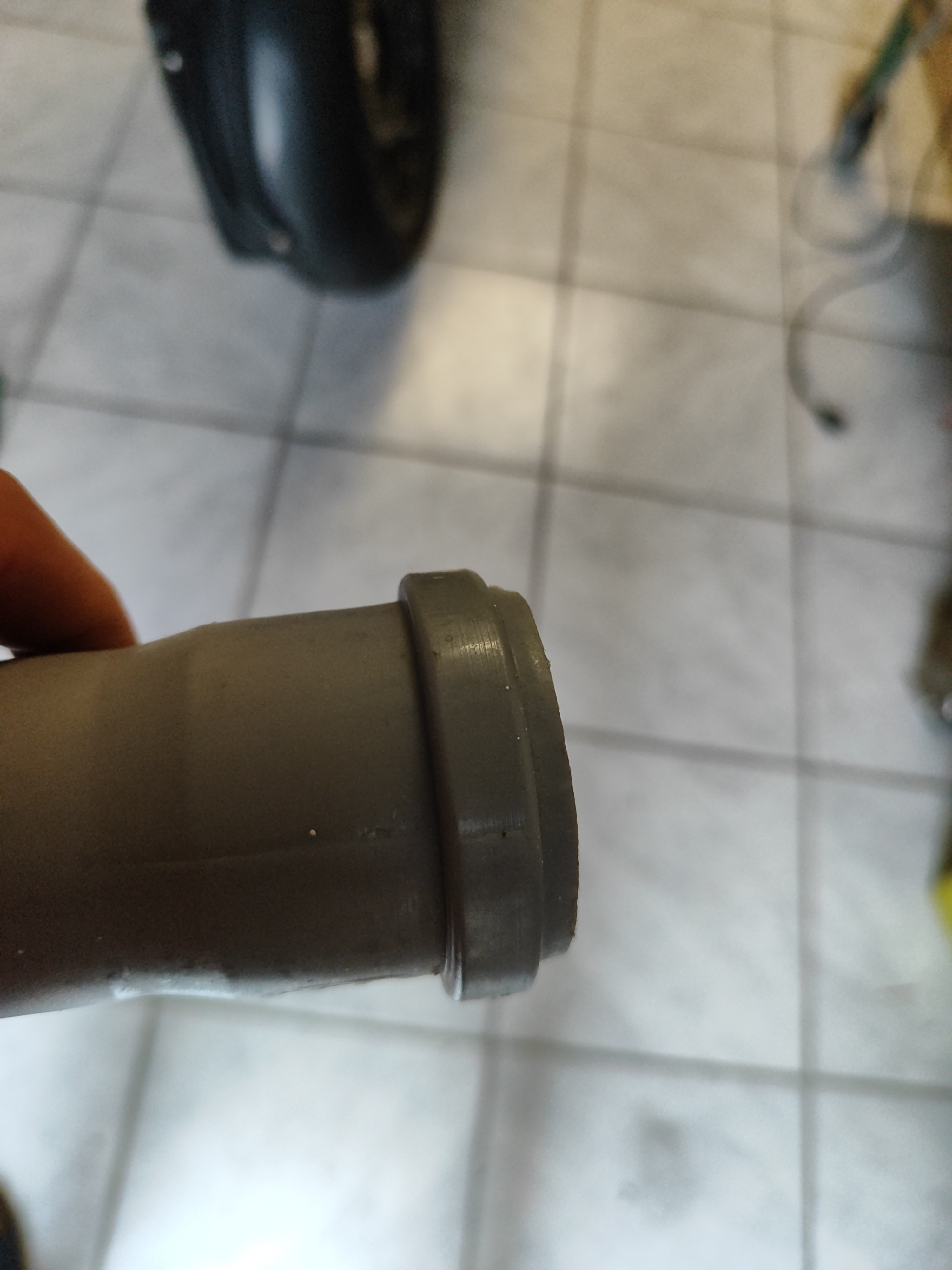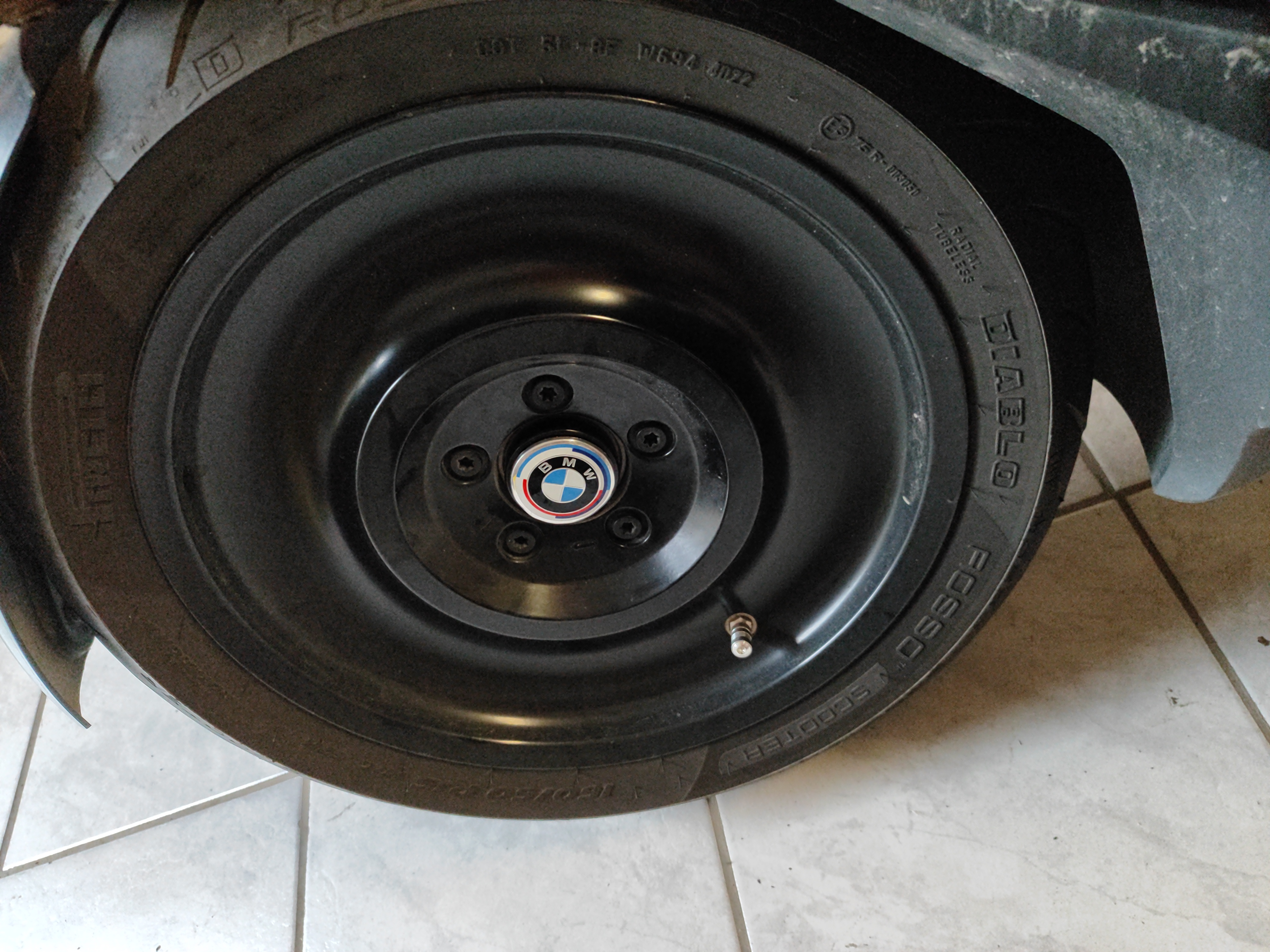 Mal noch schnell eine Nabenabdeckung gebastelt. Ein 50mm Ht Abflussrohr eignet sich dafür gut. Den Muffenkragen dazu bündig abschneiden. Etwas schwarze Farbe drauf und das Emblem mit Heißkleber angebracht.
