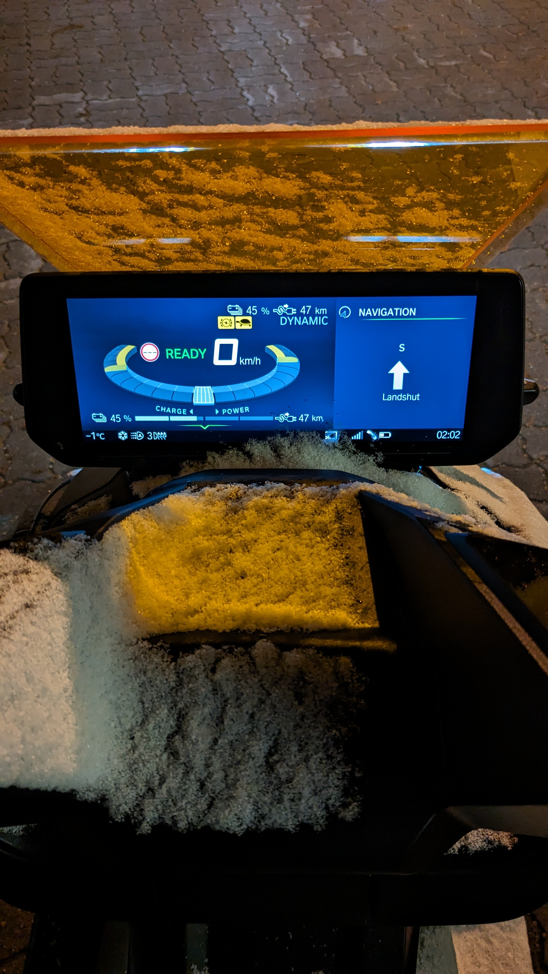 Bei -11 Grad Rekuparationwarnung gelb, bei -12 auch noch Power Ergänzung gelb, siehe Fotos. Erstes tut mir nicht weh, zweites macht Roller viel schwacher, aber 70 fährt er noch ruhig, schneller habe ich keine Strecke zu probieren. Autos hängen immer noch hinten