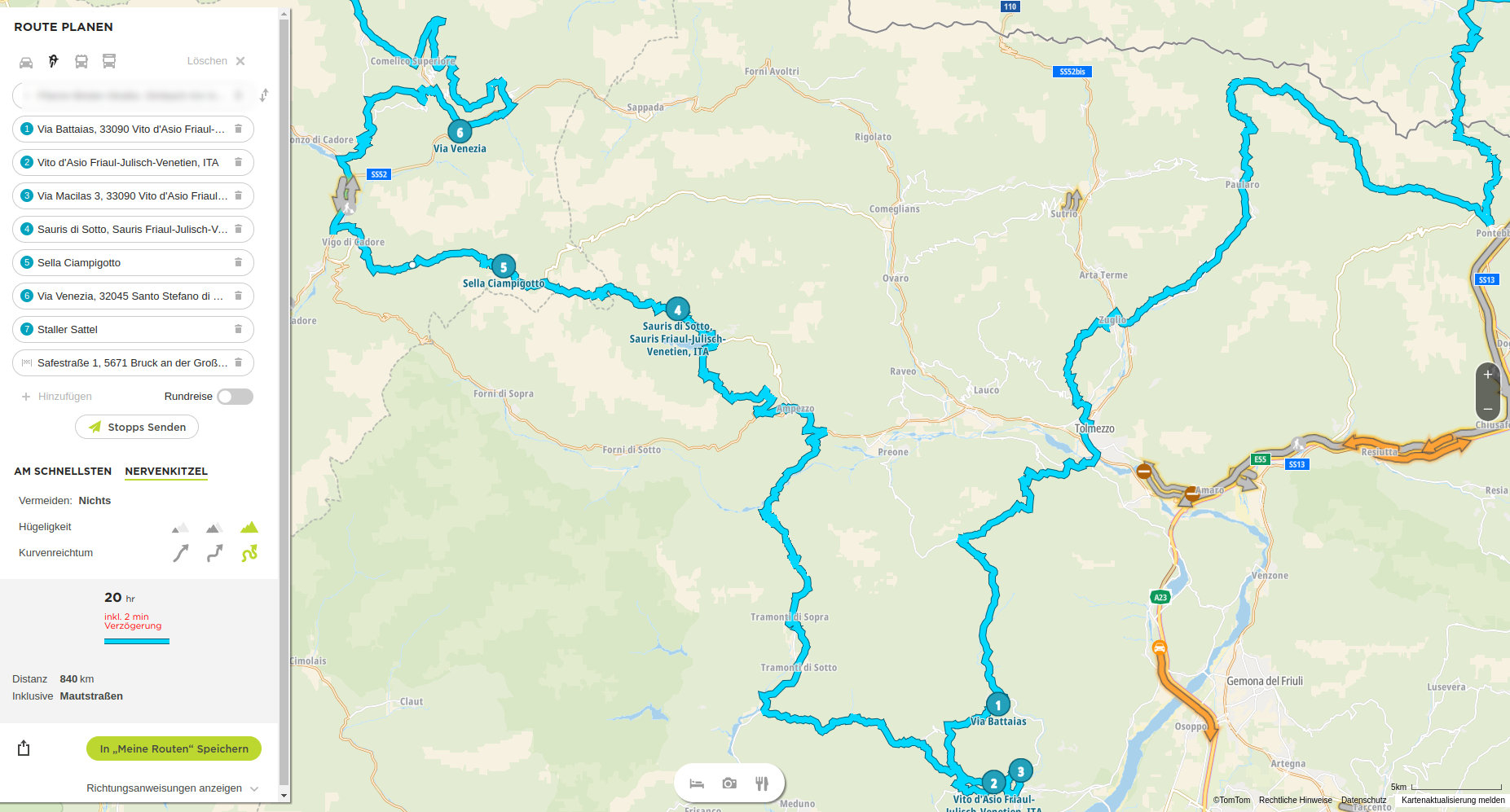 @moonser Veröffentlichen werde ich es nicht, aber wenn du das GPX in der bisherigen Form möchtest, maile ich es. Die verbleibende Rückfahrt via Glockner oder Felbertauern kann man ggfs. ad hoc machen, das ist kein Ding. Die Strecke startet in Niederbayern an der Grenze zu Österreich und geht über fraktale Traumstraßen durch den Friaul und zurück.
