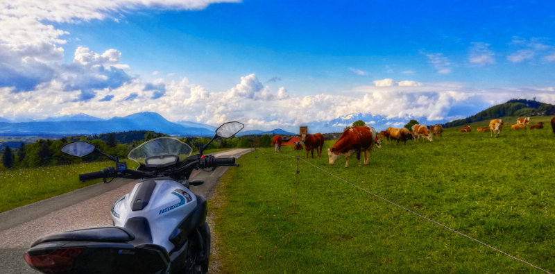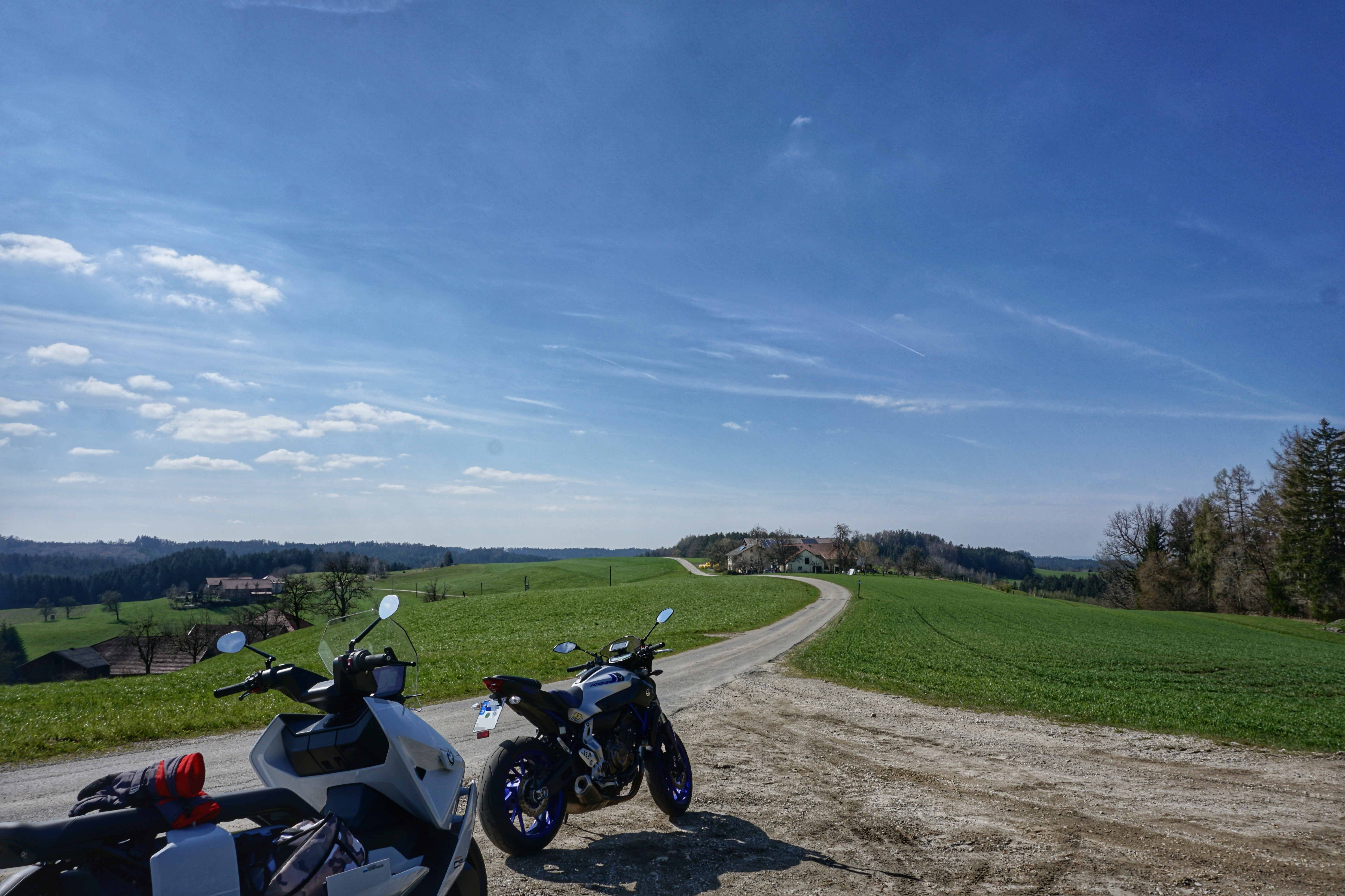 In einer extrem spitzen Kehre am Lenkeinschlag, gut Schrittgeschwindigkeit, ist die Traktionskontrolle eingefahren. Das war suboptimal. Da lag minimal Schotter, nicht viel, ein Hauch nur. Ich habe langsam und möglichst elegant balanzierend in die spitzwinklige enge Einmündung reingelenkt, es gut erwischt und dann beschleunigt, man will ja auch nicht nach innen umfallen. Aber abgesehen vom gelben Warnsignal im Display ist halt keine Beschleunigung erfolgt. Null. Da war dann ein leichter Stützfuss fällig. Kleiner Schreck. Kein grosses Problem, aber halt bemerkenswert. Auch so ein schönes feinfühliges TCS ist kein Alleskönner.