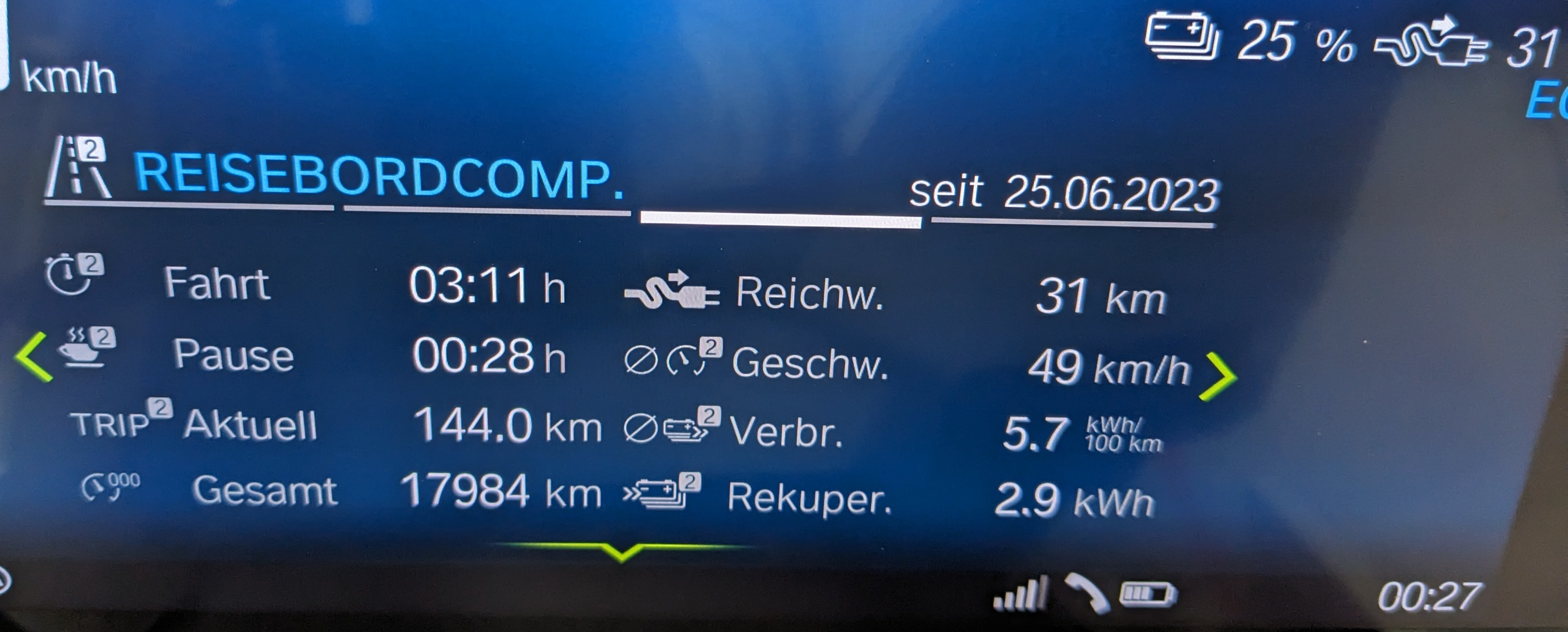 Diesmal müsste auch der Fahrtschnitt stimmen. Die Ladepause wurde nicht einberechnet und weitere grobe Stehzeiten gab es nicht.