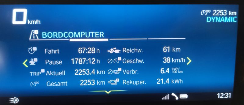 Ich habe den Bordcomputer mehrfach resettet, also keine Gesamtstatistik. Leider. Seit ca 700km lasse ich es unberührt. Da stehen 6,5kWh/100km Verbrauchsschnitt, weil ich da nur längere und eher verbrauchseffiziente Touren gefahren bin. Die heutigen 182km (allein unterwegs) lagen zum Schluß bei 6,8kWh/100km Schnitt, trotz häufiger größerer Bundesstraßen mit erhöhtem Tempo, aber eben dann doch wieder die ausgiebigen 30er Zonen und Nerv-Kolonnen in Ortsnähe, wo man sich dann auf den sparsamen Antrieb besinnt und sich immerhin darüber freuen kann.