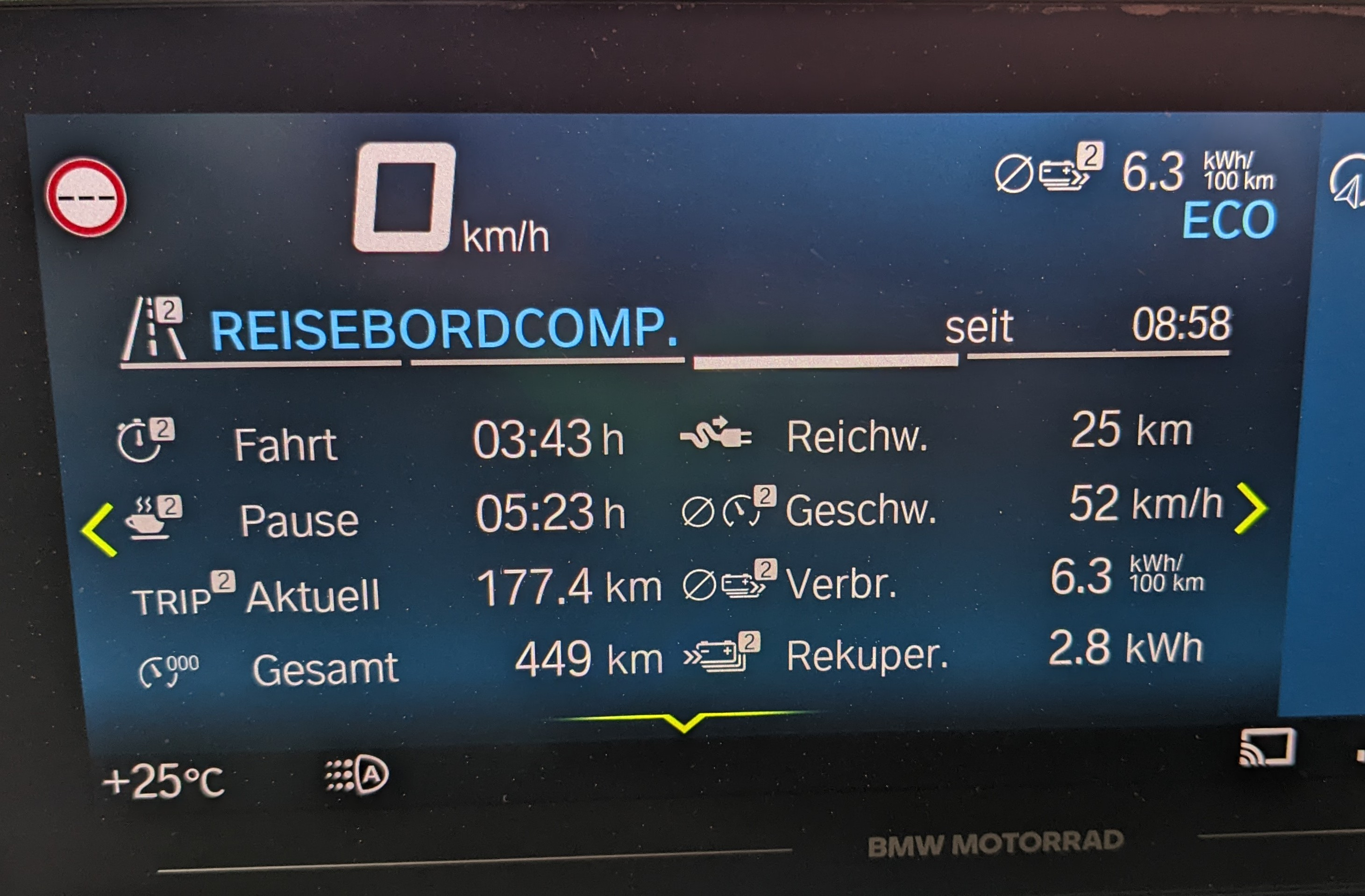 Und ich kann bereits sagen: Stromverbrauch geht inzwischen runter gegenüber den Erstfahrten! Das ist total spannend. Überland Eco inzwischen eher Richtung 7.5kWh/100km. Eventuell wird der Antrieb auch leiser, aber da bin ich unsicher, weil ich verschiedene Helme verwende.