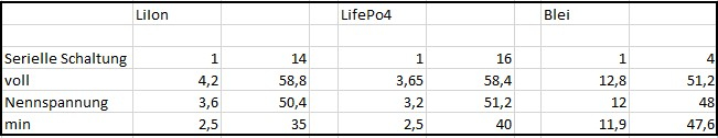 Vollladespannung mit 4,2 Volt je Zelle und 58,8 Volt Ladegeräte-Schlussspannung liegt leicht über dem 4xBlei-Ladeschluss, wird von den Komponenten aber im allgemeinen vertragen.