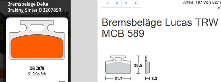 Danke Dir noch einmal-> der Tipp mit den Delta oder TRW-Belägen ist echt Gold wert.xinoip hat geschrieben:Schau hier, oben liegen die Delta, darunter die Original UNU :...