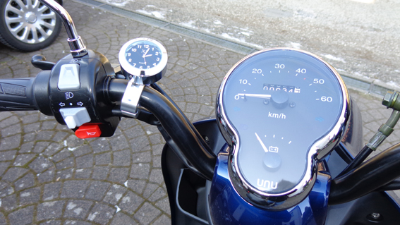 Da bei mir auf dem Weg zur Arbeit jede Minute zählt, war mir eine Lenkeruhr sehr wichtig: http://www.ebay.de/itm/Motorraduhr-Uhr- ... 462cce9d3d Bei ebay habe ich eine kleine batteriebetriebene Alarmanlage mit Fernbedienung gefunden, die ich am Boden des Unu-Akkufachs auf einen kleinen Schraubenkopf stecken kann. Der Alarm bei Erschütterung ist zwar nicht mega laut, aber die 40 Sekunden Krach schrecken denke ich trotzdem ab