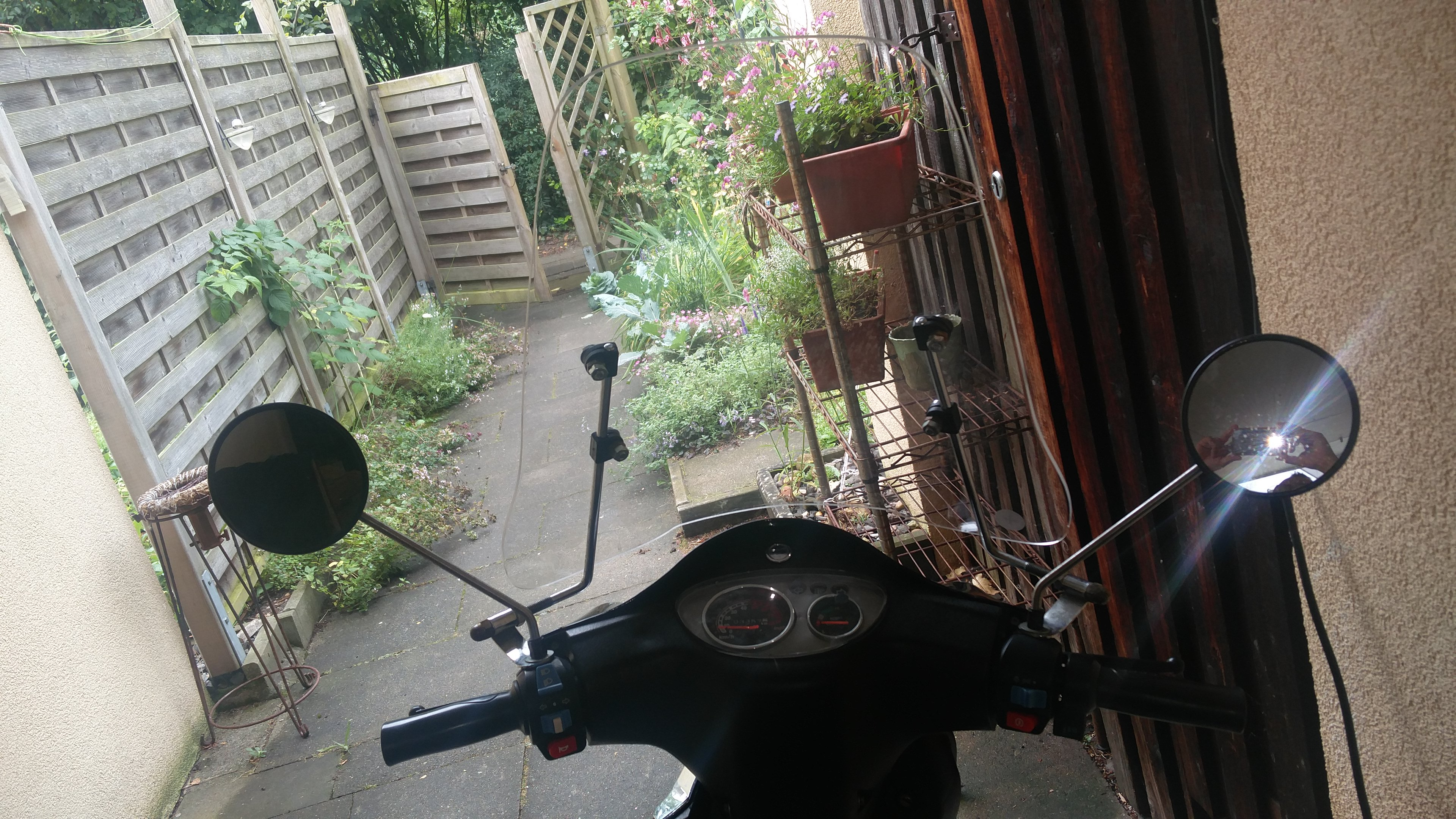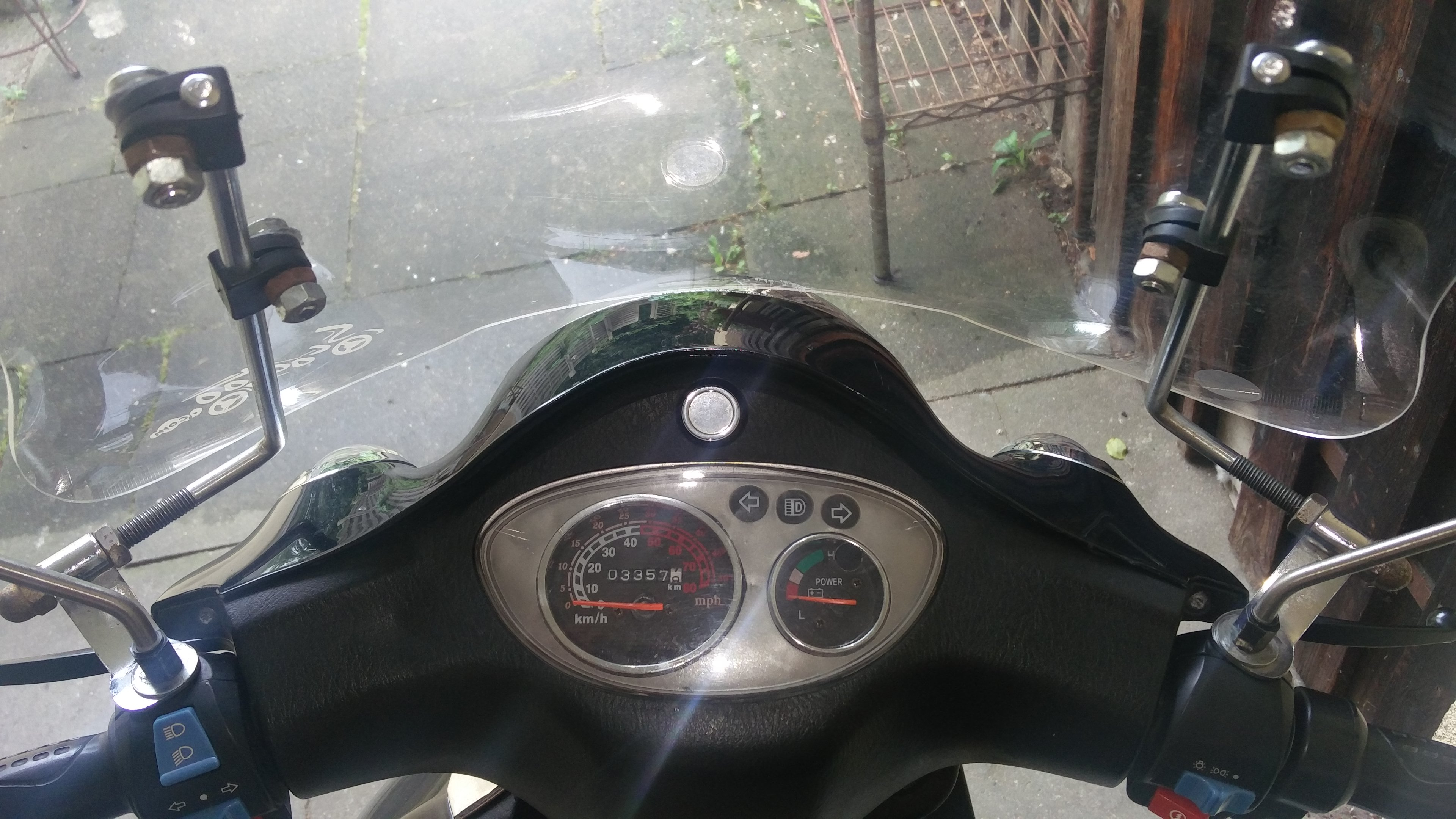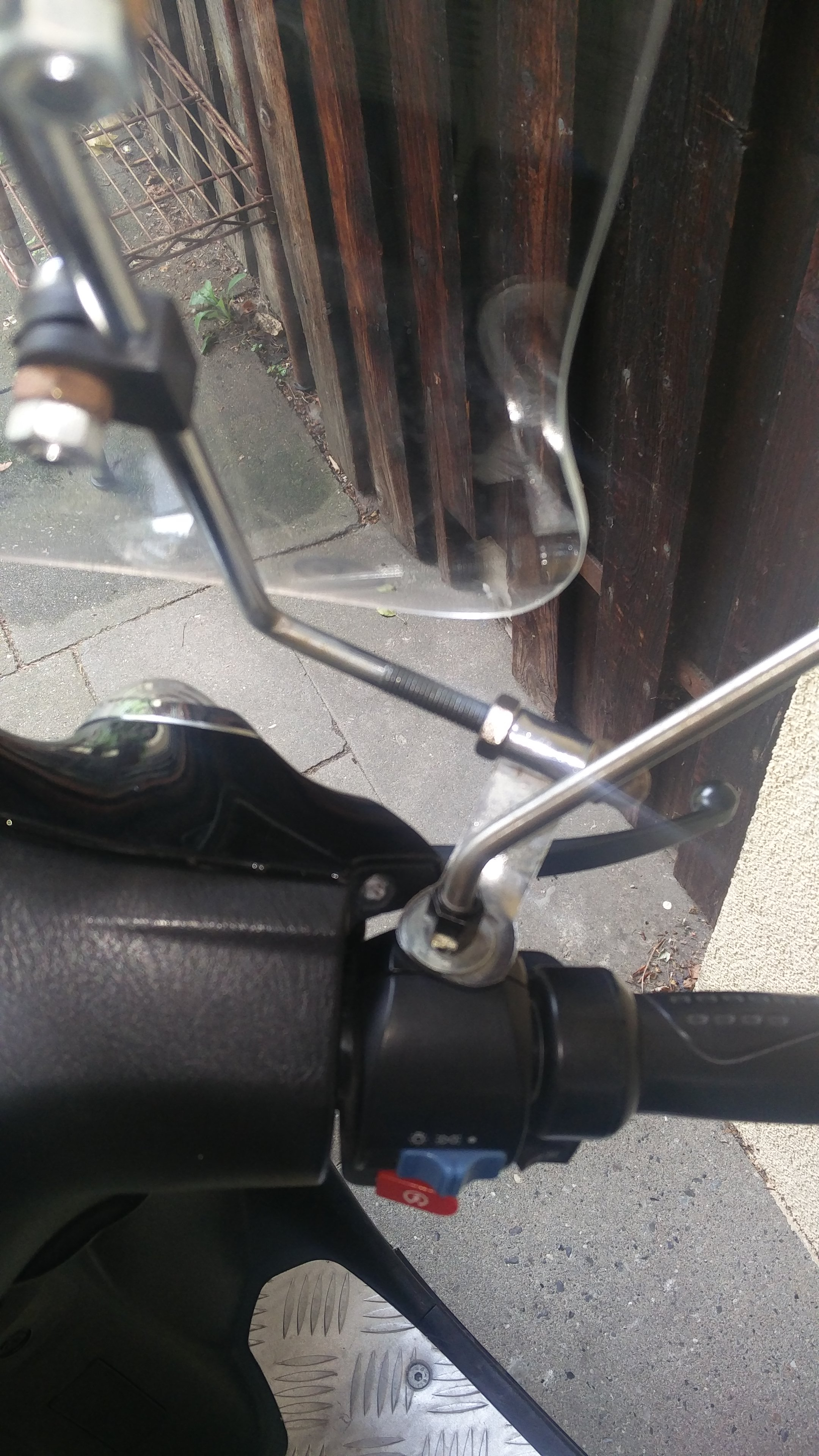 Hier Mal ein aktuelles Bild von Lenker mit Spiegel und Schild. Das Ausrichten ist nicht ganz gelungen, aber es ist fast gerade geworden.