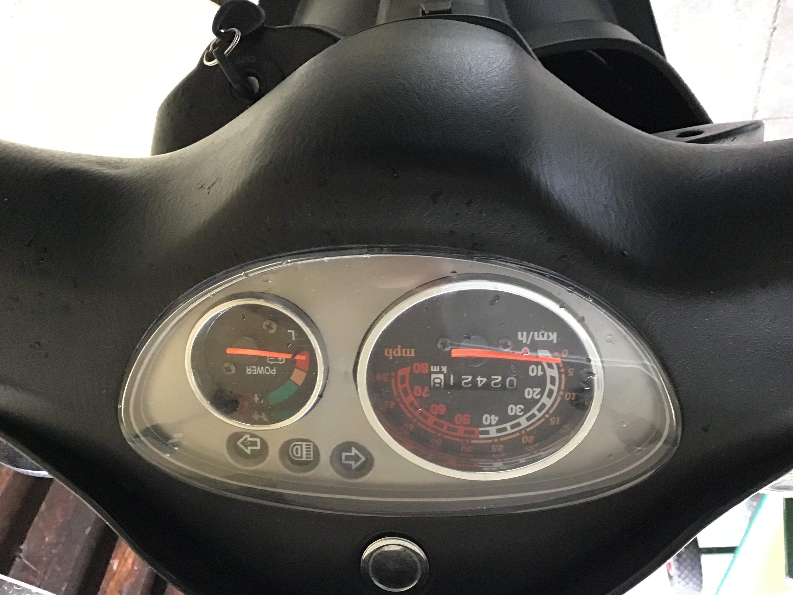 In der vorderen Verkleidung des Lenkers fehlen die beiden unteren Schrauben, das war bestimmt ein mächtiges Geklapper.
