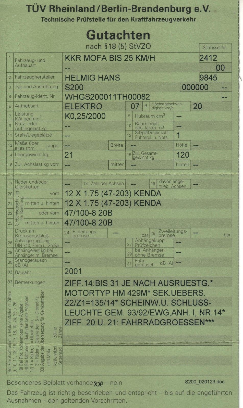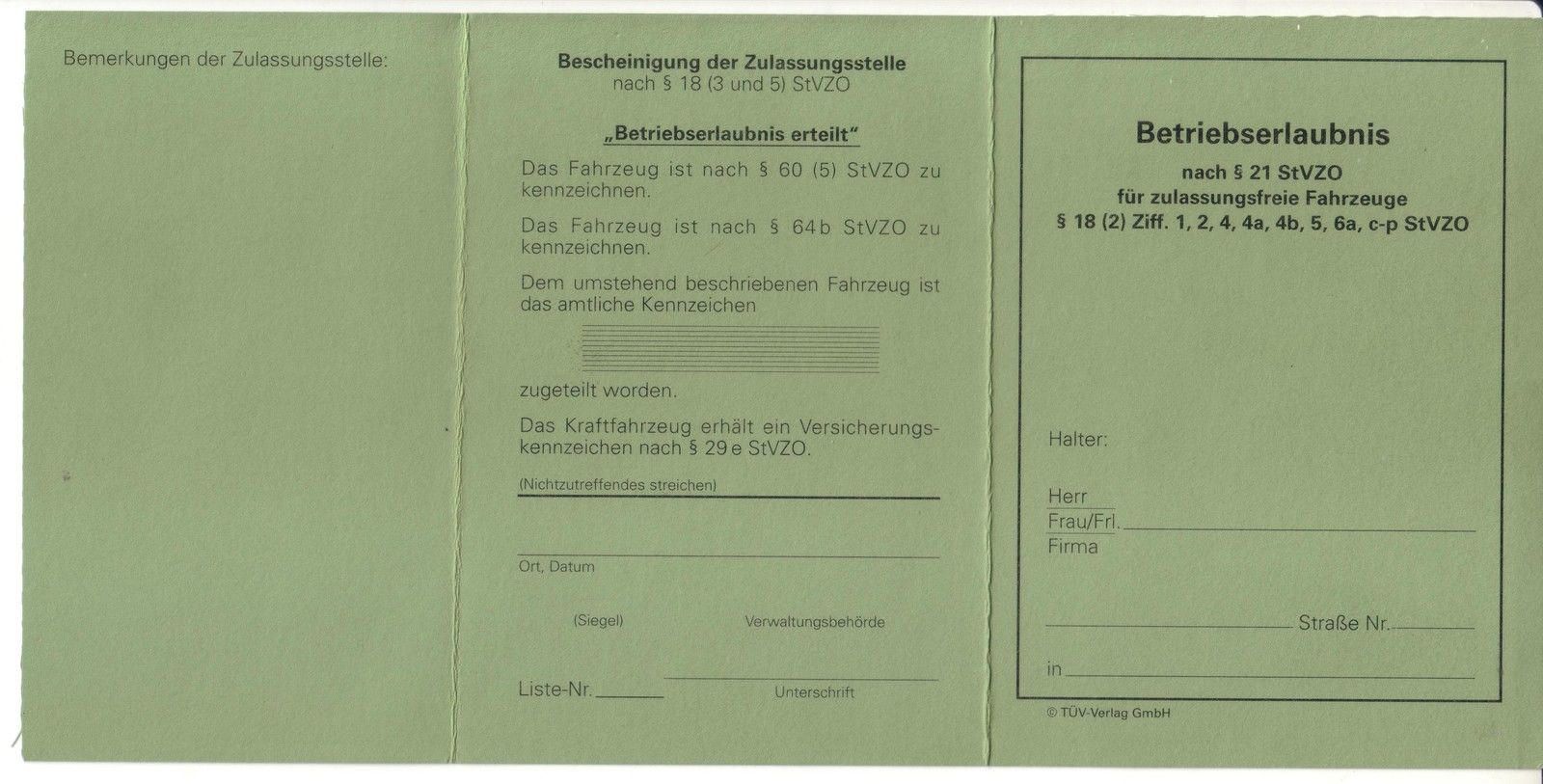Das passt in dem Zusammenhang nicht, weil StVZO schon bald 10 Jahre nicht mehr relevant.Ganter Ingo hat geschrieben:und eine Betriebserlaubnis nach Prüfung zur Erteilung eines Kennzeichens.