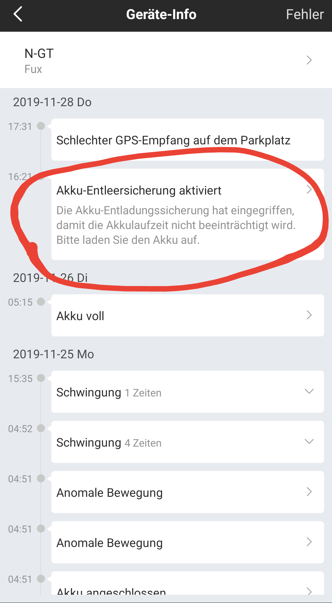 Er hatte nach dem letzten Vollladen diesen Fehler geschmissen... Ich war gerade in der Bahn zur Arbeit und auf einmal meldet NIU, dass mein Akku voll geladen hat... Der typische Fehler, welcher alle zwei Monate Auftritt. Hmmm....